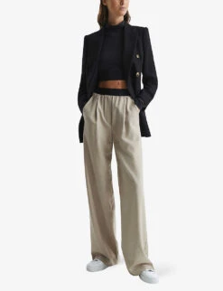 - Regular fit, low rise, wide flared leg, structured waistband with belt loops, darts at back, two welt pockets at back, satin texture, stitched centre creases