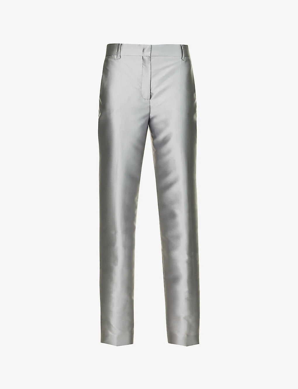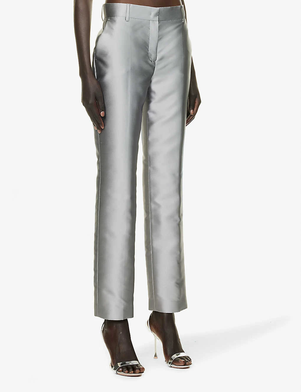 - Regular fit, mid-rise, straight leg, structured waistband with belt loops, two slip pockets at front, darts at back, satin texture, pressed centre creases