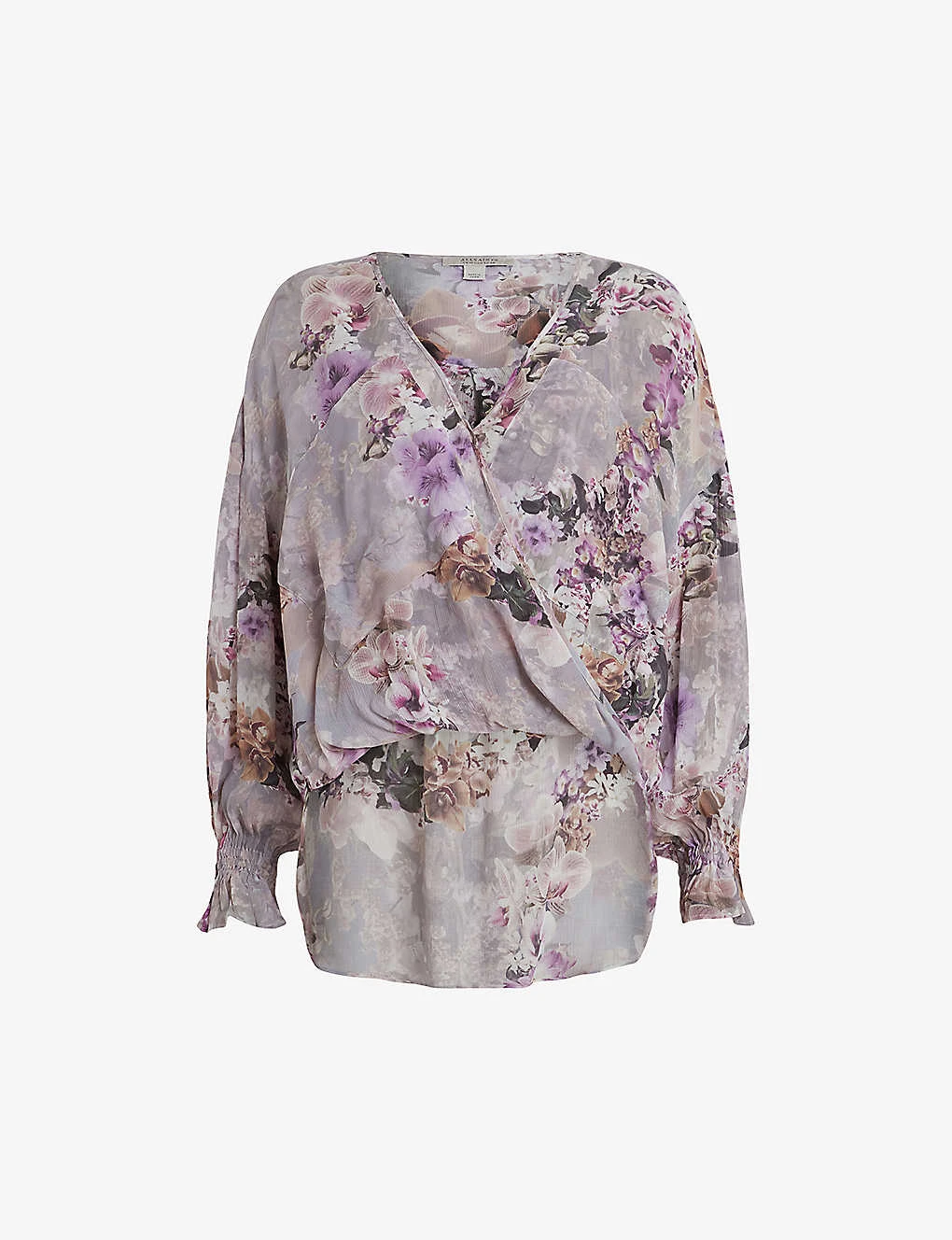 - Relaxed fit, V-neckline, long sleeves, wrap front design, curved back hem, all-over floral print, unlined