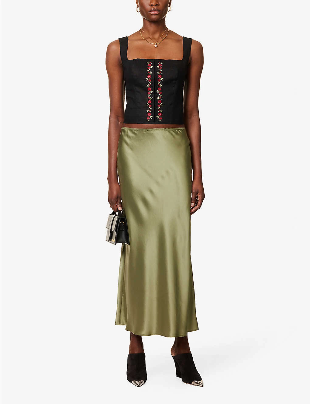 - Slim fit, sweetheart neckline, shoulder straps, embroidered pattern at front, hook-and-eye fastening at front, cropped, shirred panel at back, lined