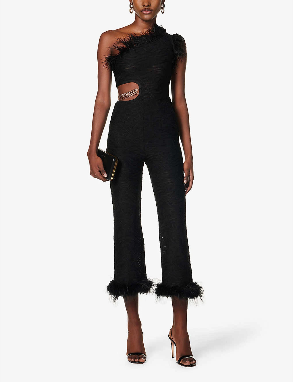 - 97% polyester, 3% elastane; lining 100% polyester; trims 100% faux feather