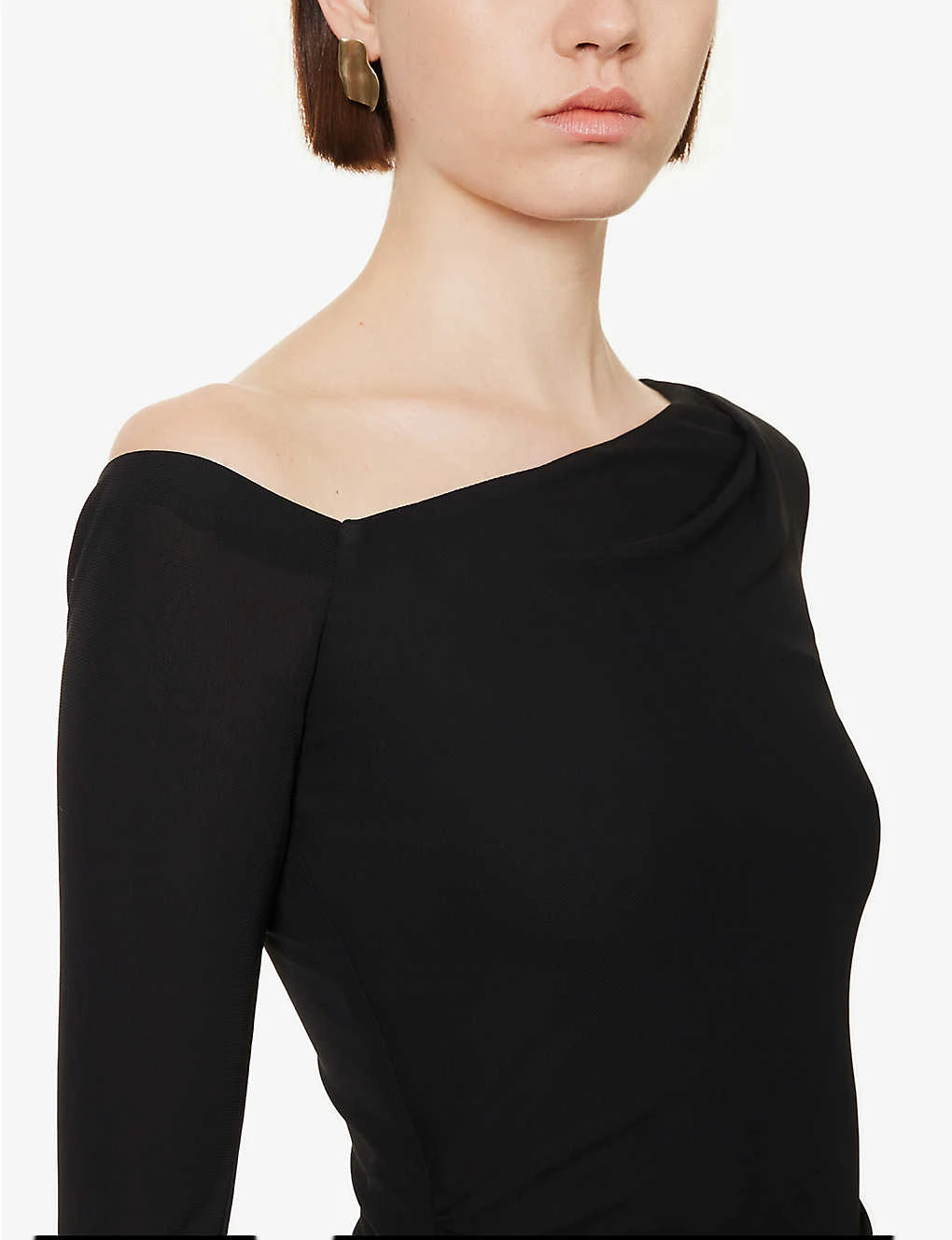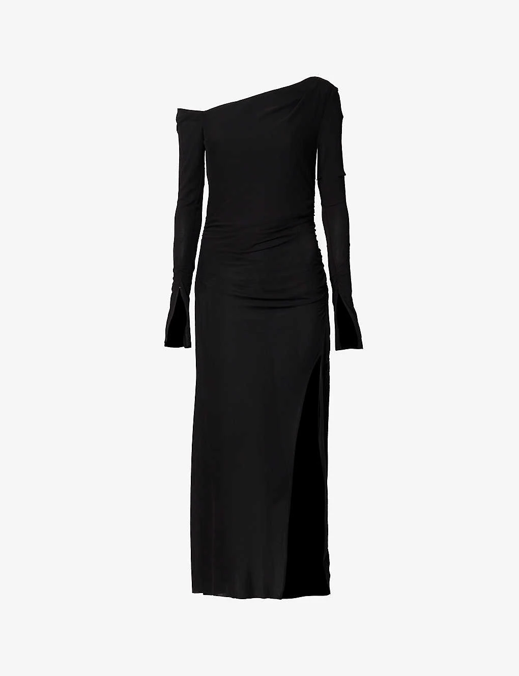 - Fitted, straight-across-neck, off-the-shoulder long sleeves, ruched at sides, asymmetric split hem, lined