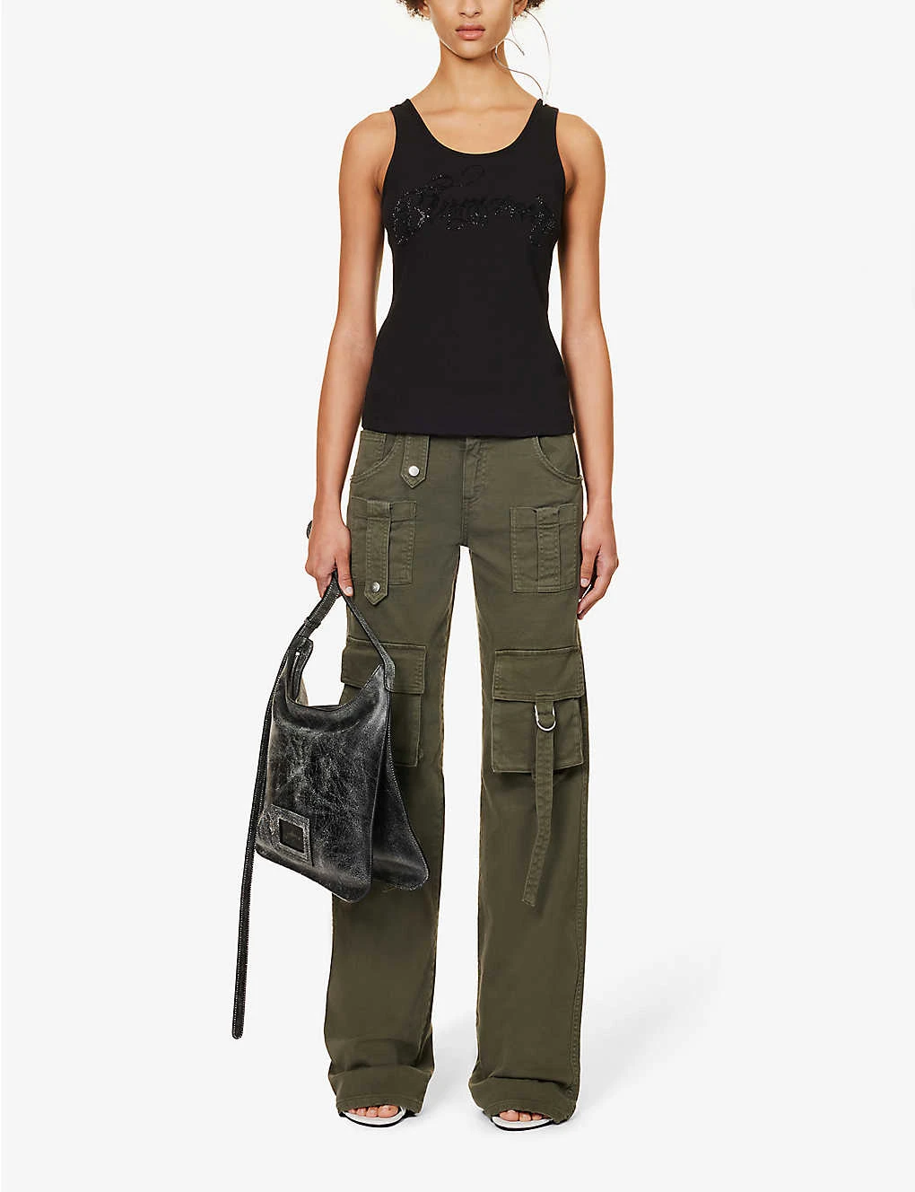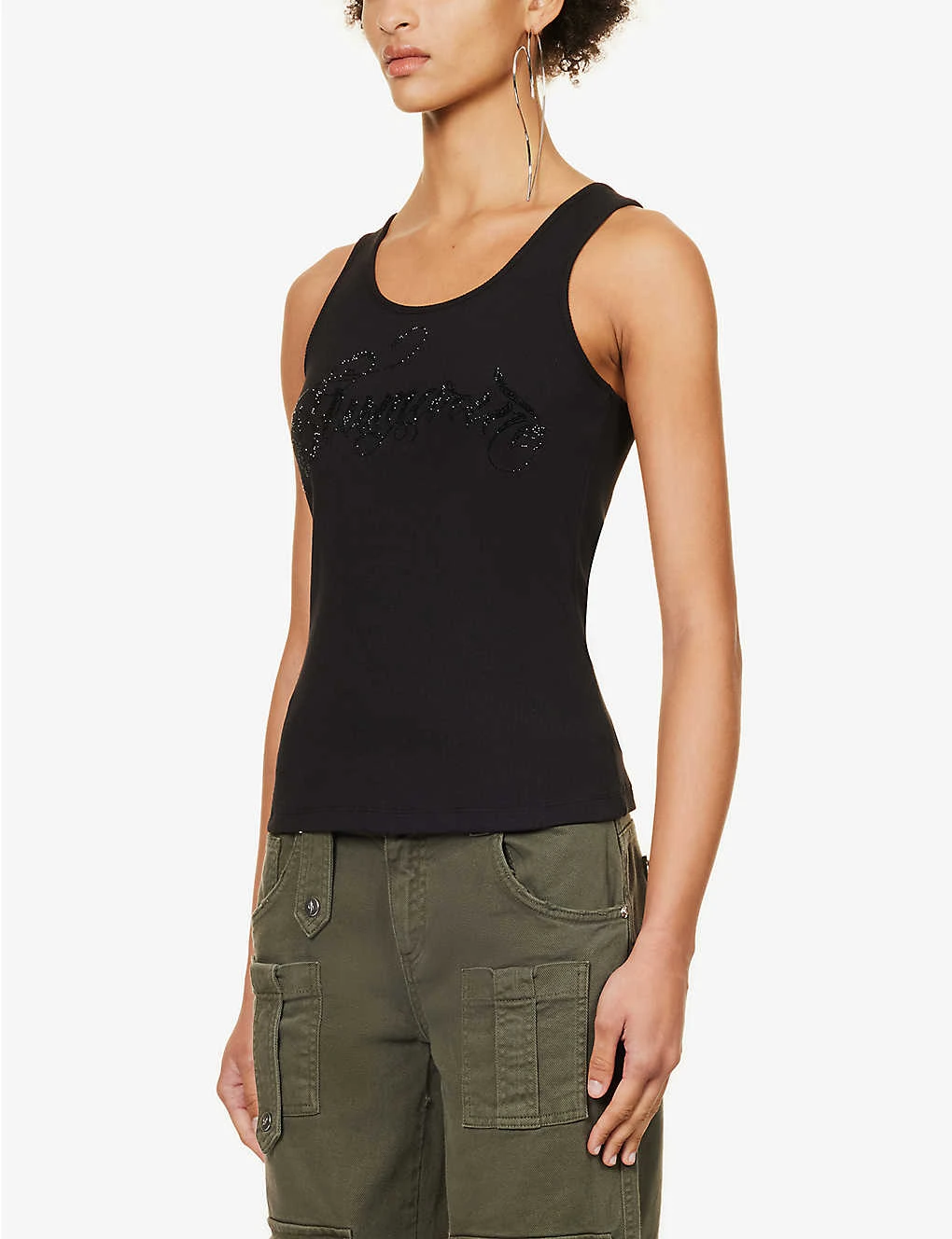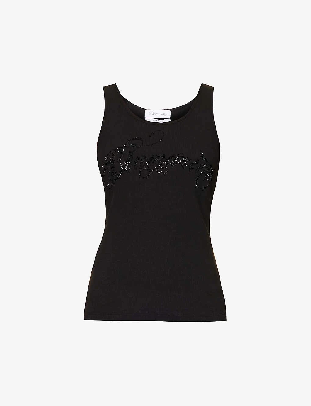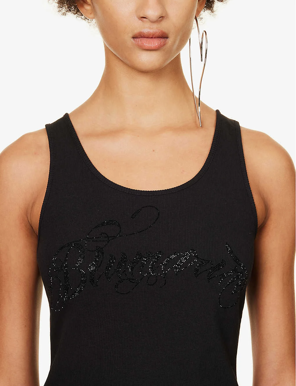 - Regular fit, scoop neck, sleeveless, dropped armholes, brand text rhinestone design at front, ribbed texture