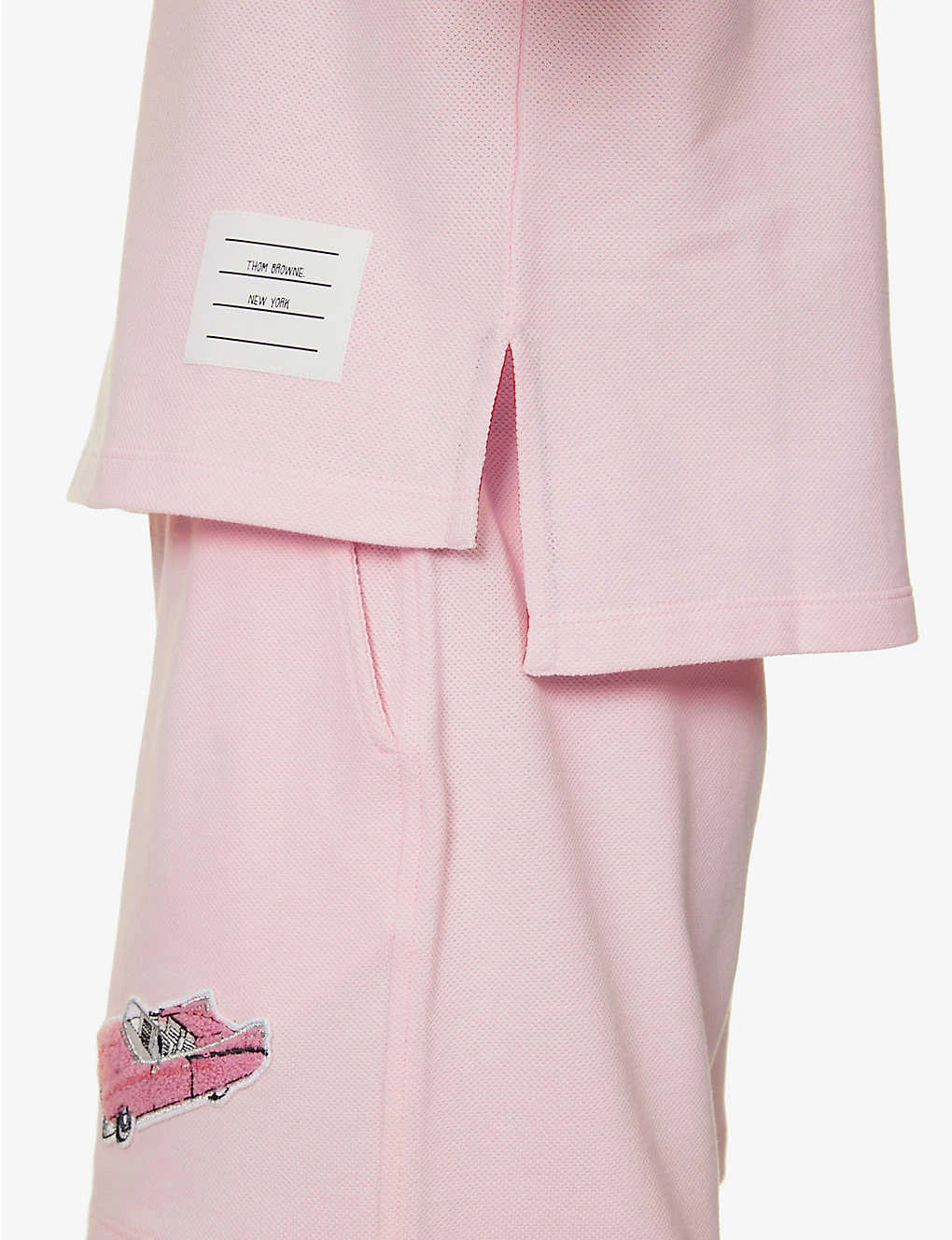 - Relaxed fit, round neckline, ribbed trim at neck, short sleeves, flocked brand appliqué at chest, brand appliqué at front, brand stripe tab at back, all-over piqué texture, split at hem sides, dipped hem