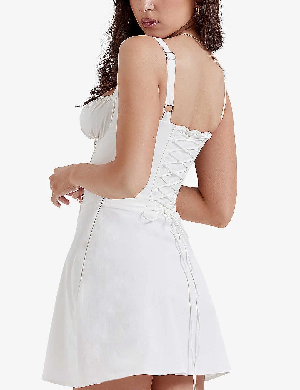 - Adjustable straps, square neckline, tie-front detail, fitted bodice, mini silhouette, lace-up back, silver-tone hardware