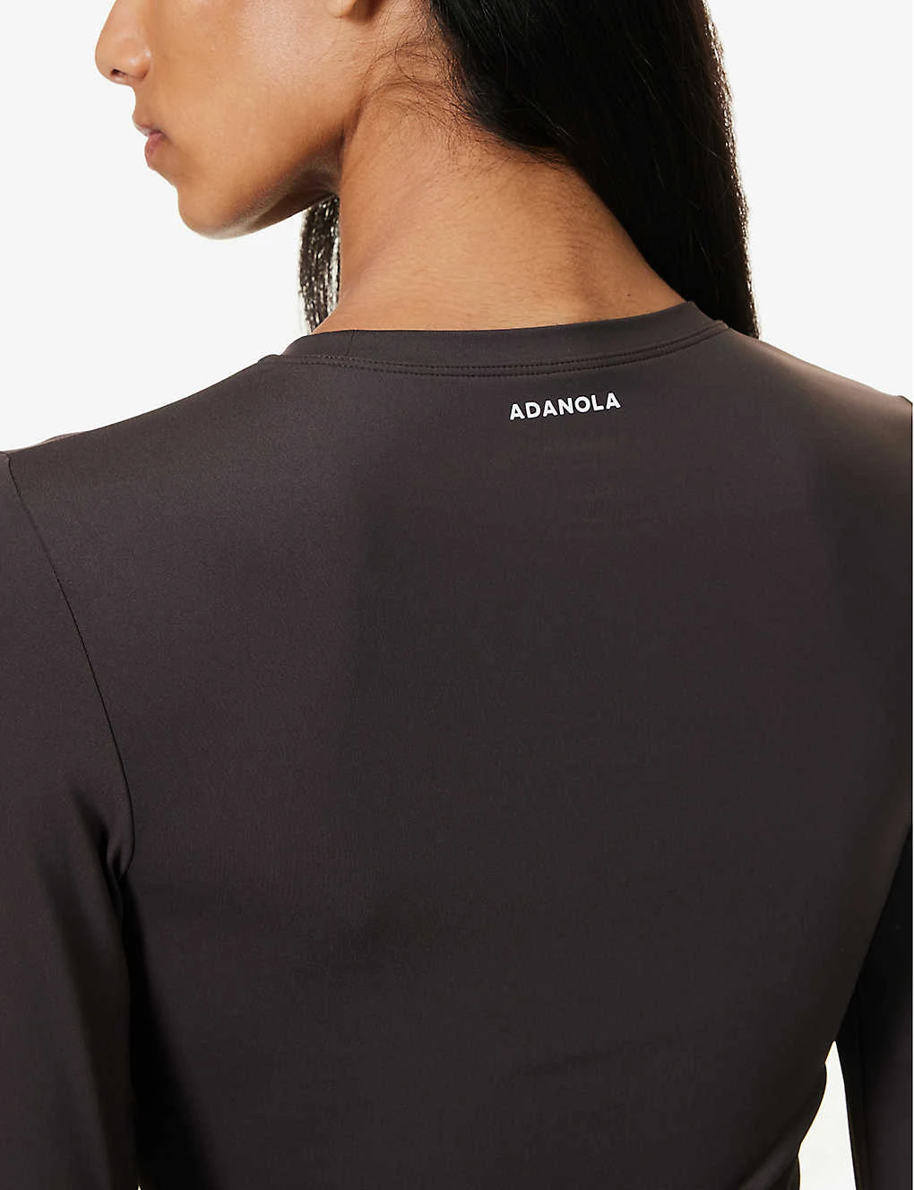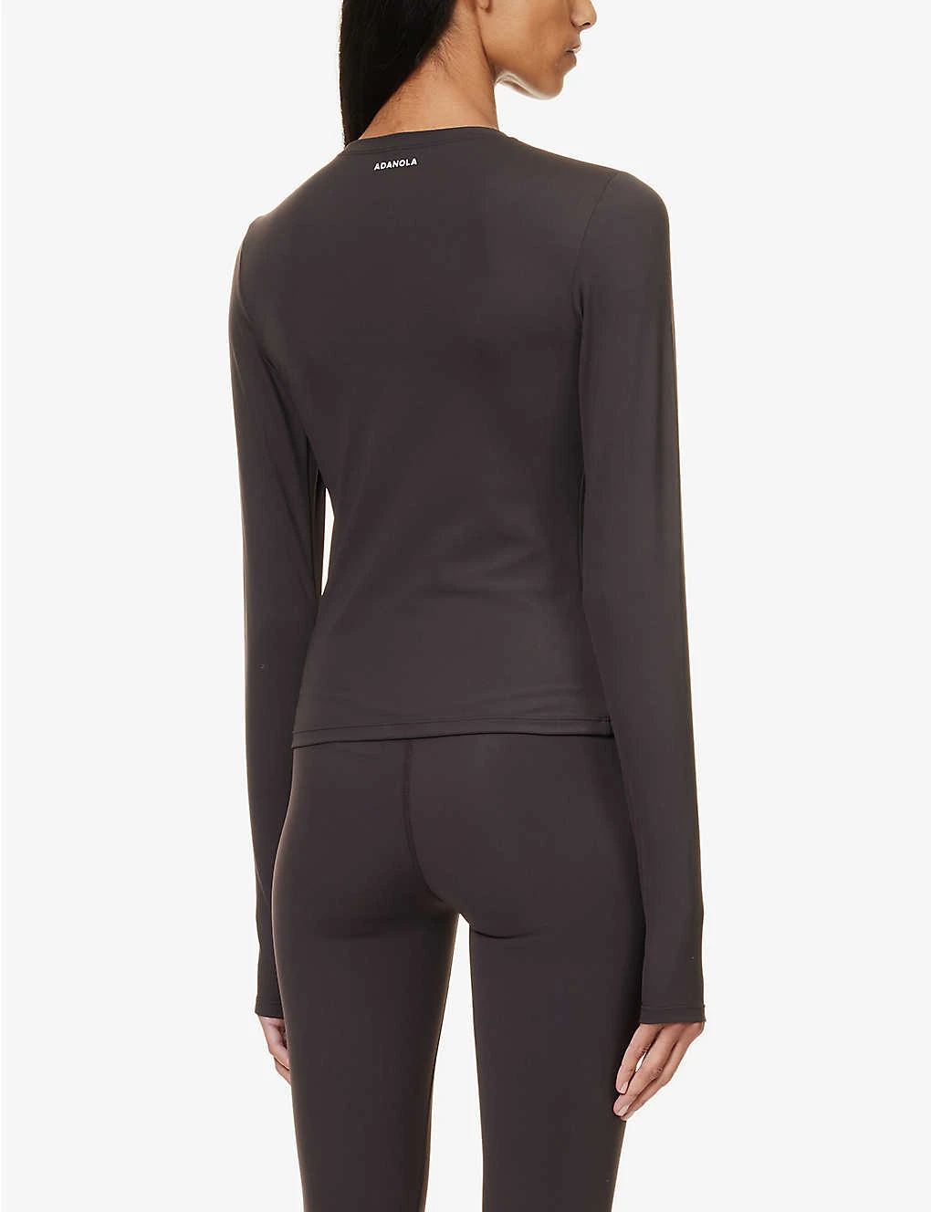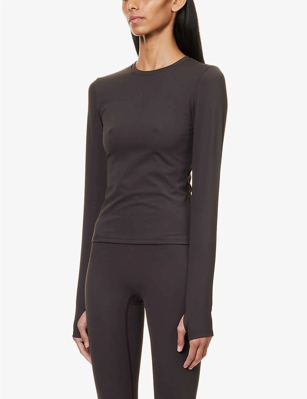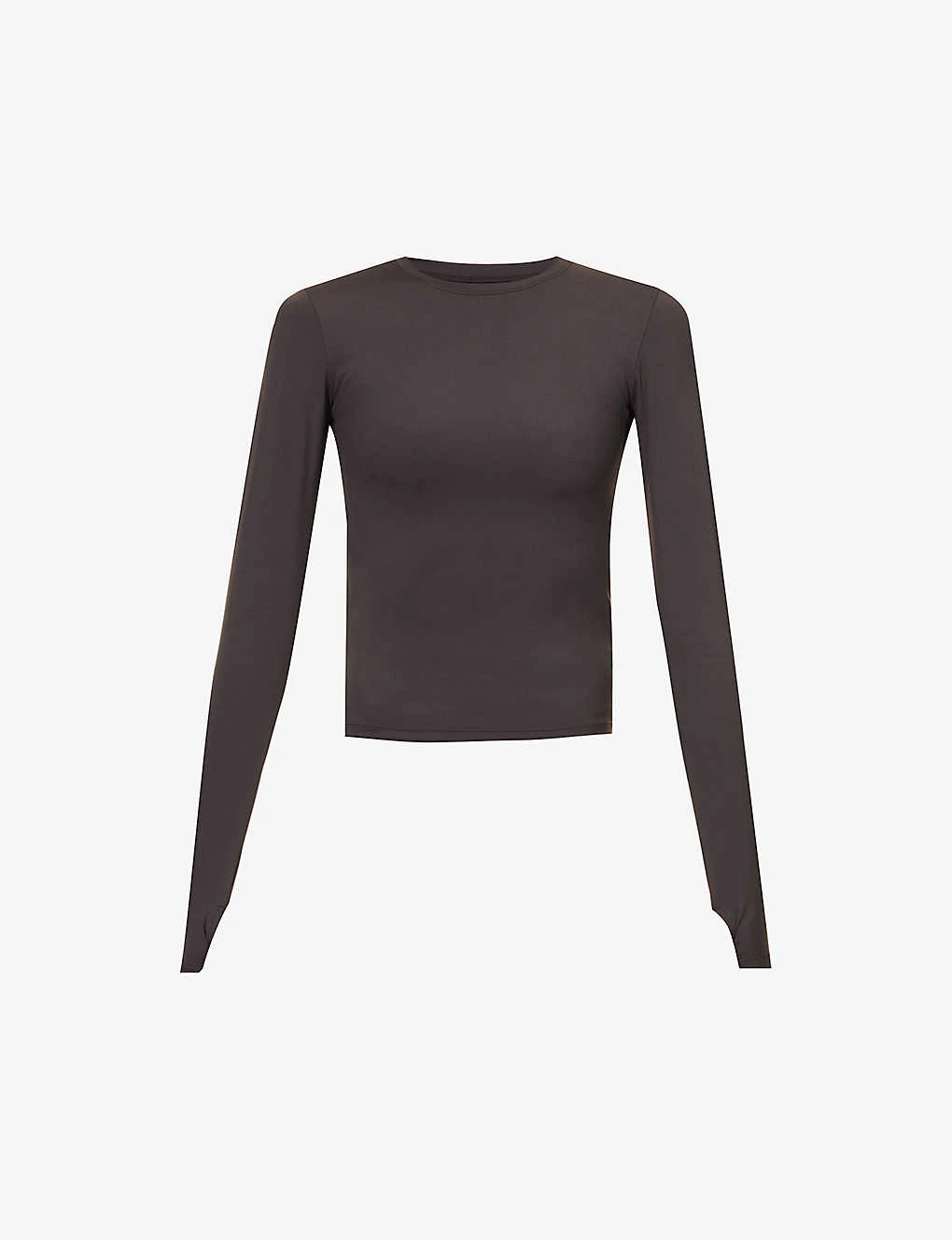 - Fitted, round neck, ribbed trim at neck, long sleeves, thumbhole cuffs, branded print at back