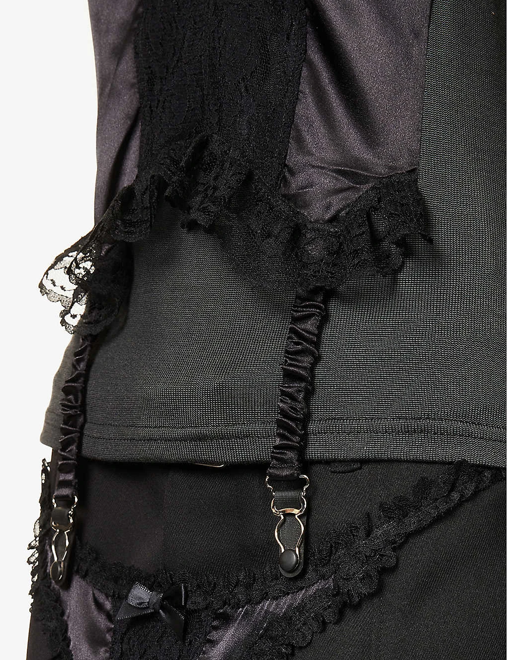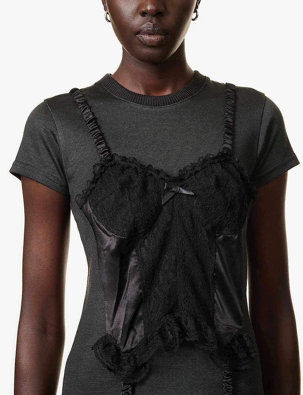 - Regular-fit, scoop neck, ribbed trim at neck, short sleeves, lace and satin corset appliqué design at front