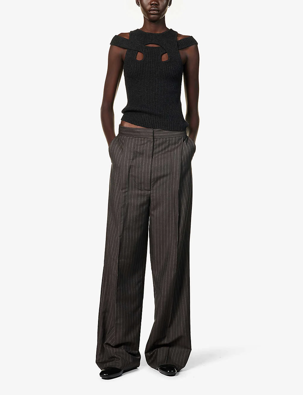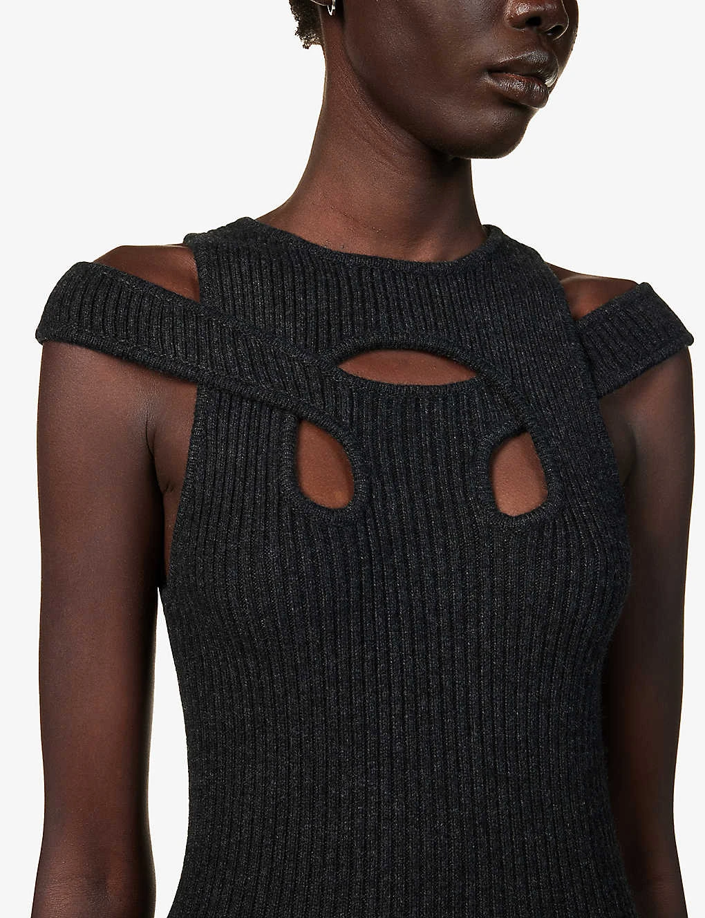 - Slim fit, round neck, sleeveless, double straps, cut-out panels at front, ribbed knit, brushed texture