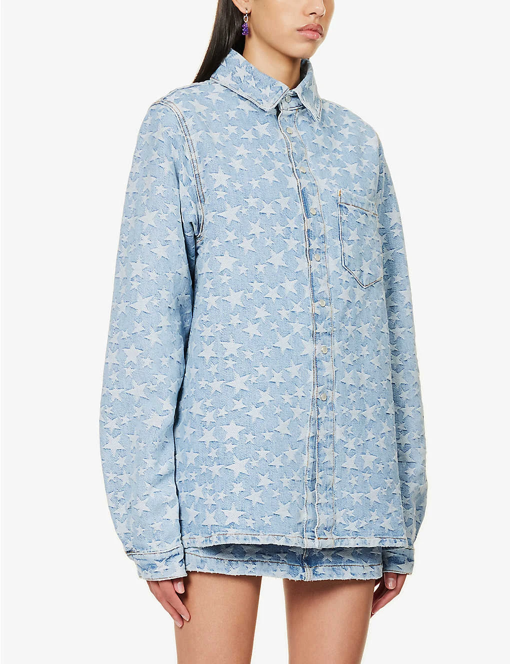 - Relaxed fit, collar, long sleeves, buttoned sleeve hems, patch pocket at chest, straight yoke with double pleat at back, all-over star pattern, faded wash, contrast stitching