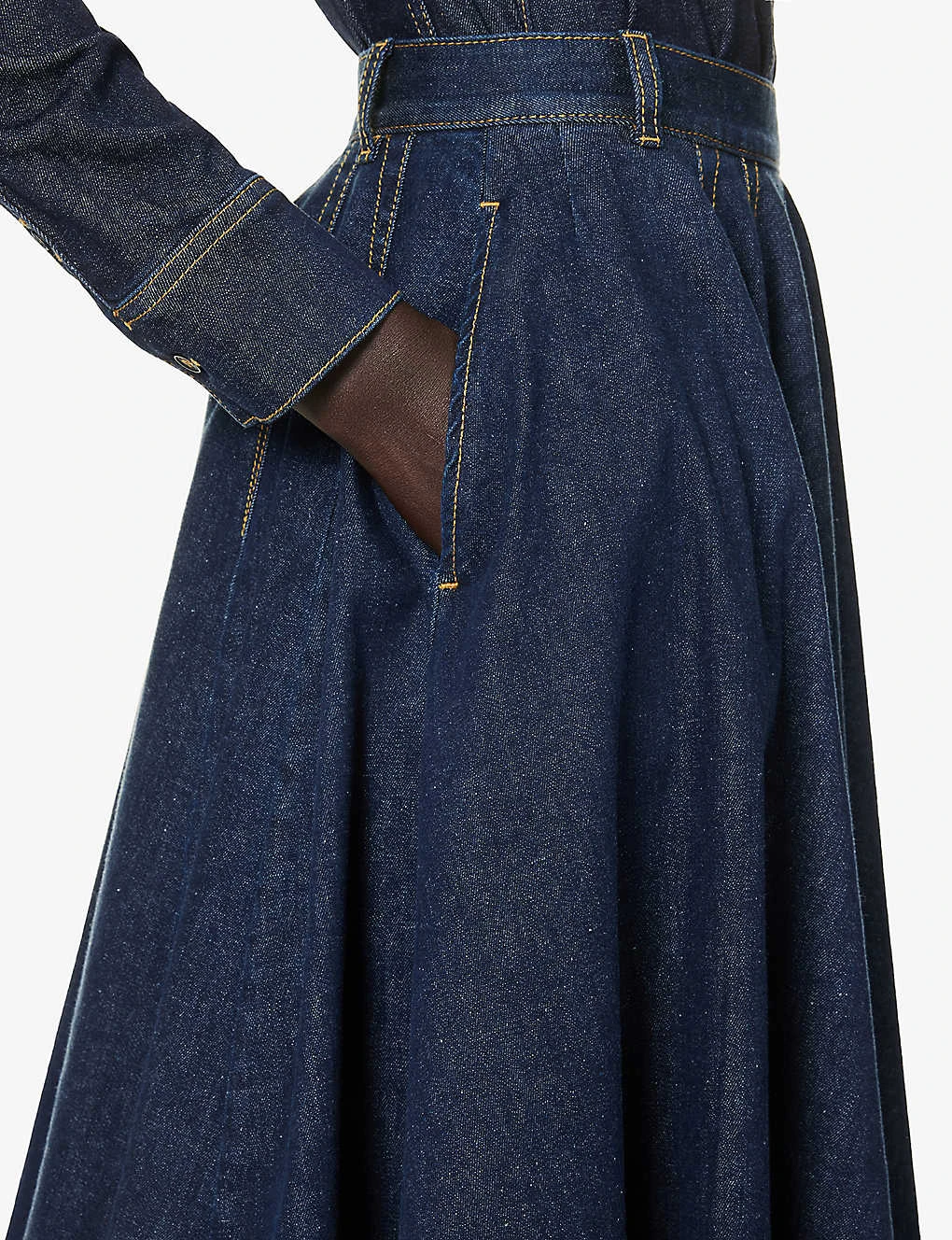 Be the first to review “Flared-hem Contrast-stitching Stretch-denim Midi Skirt” Cancel reply
