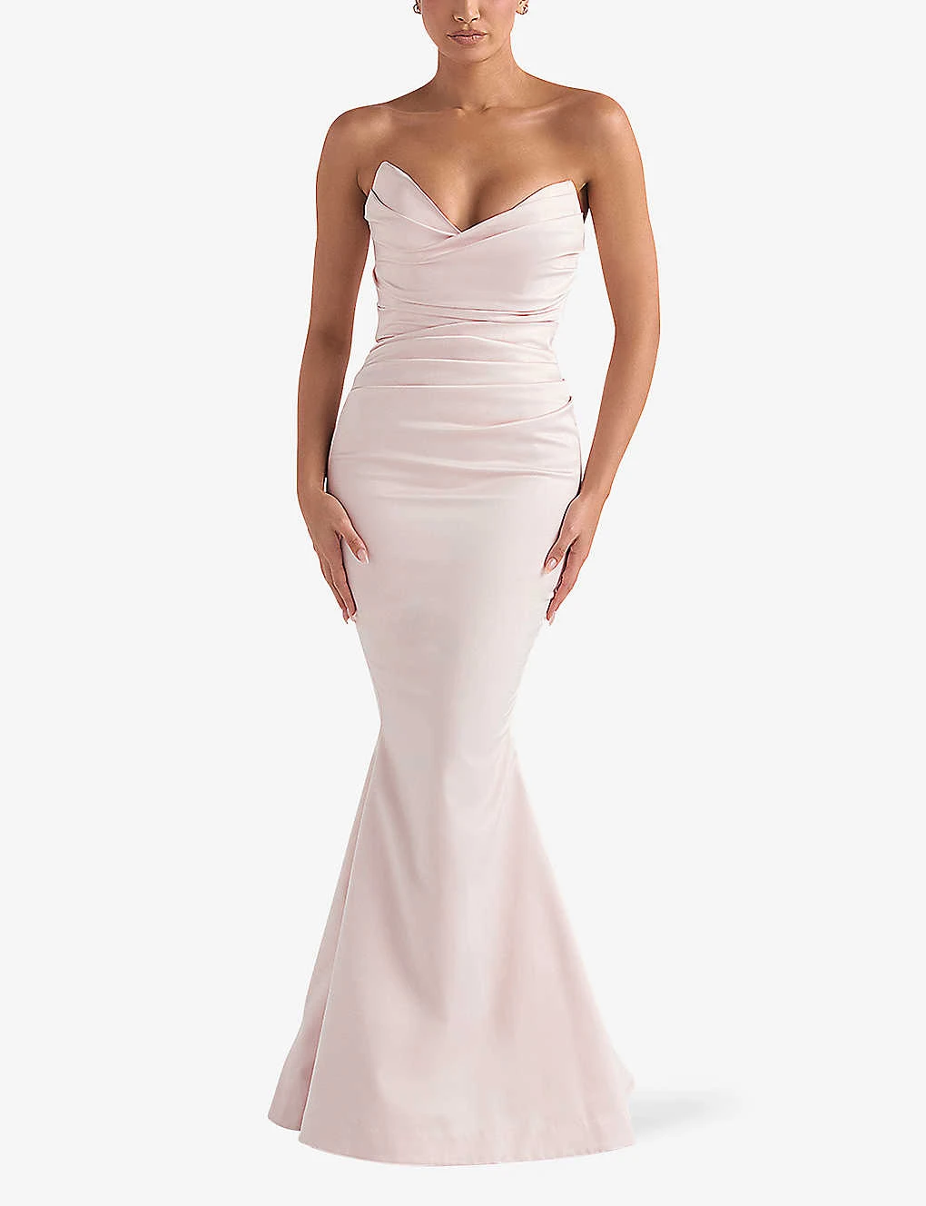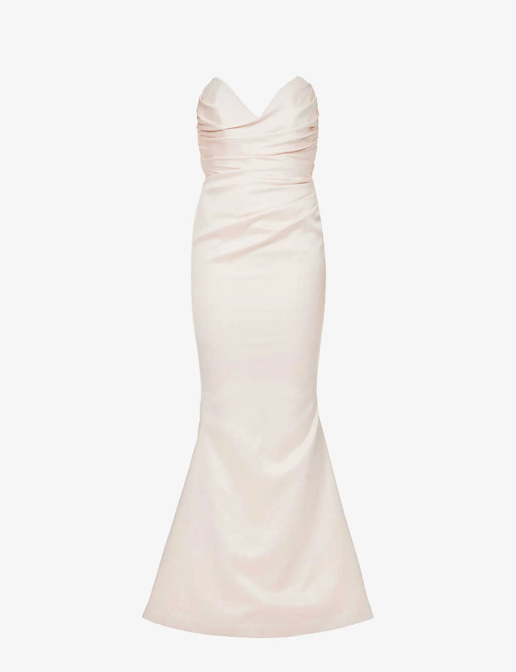 - Slim fit, peak sweetheart neckline, sleeveless, soft gathered pattern at front, fishtail hem, fully lined