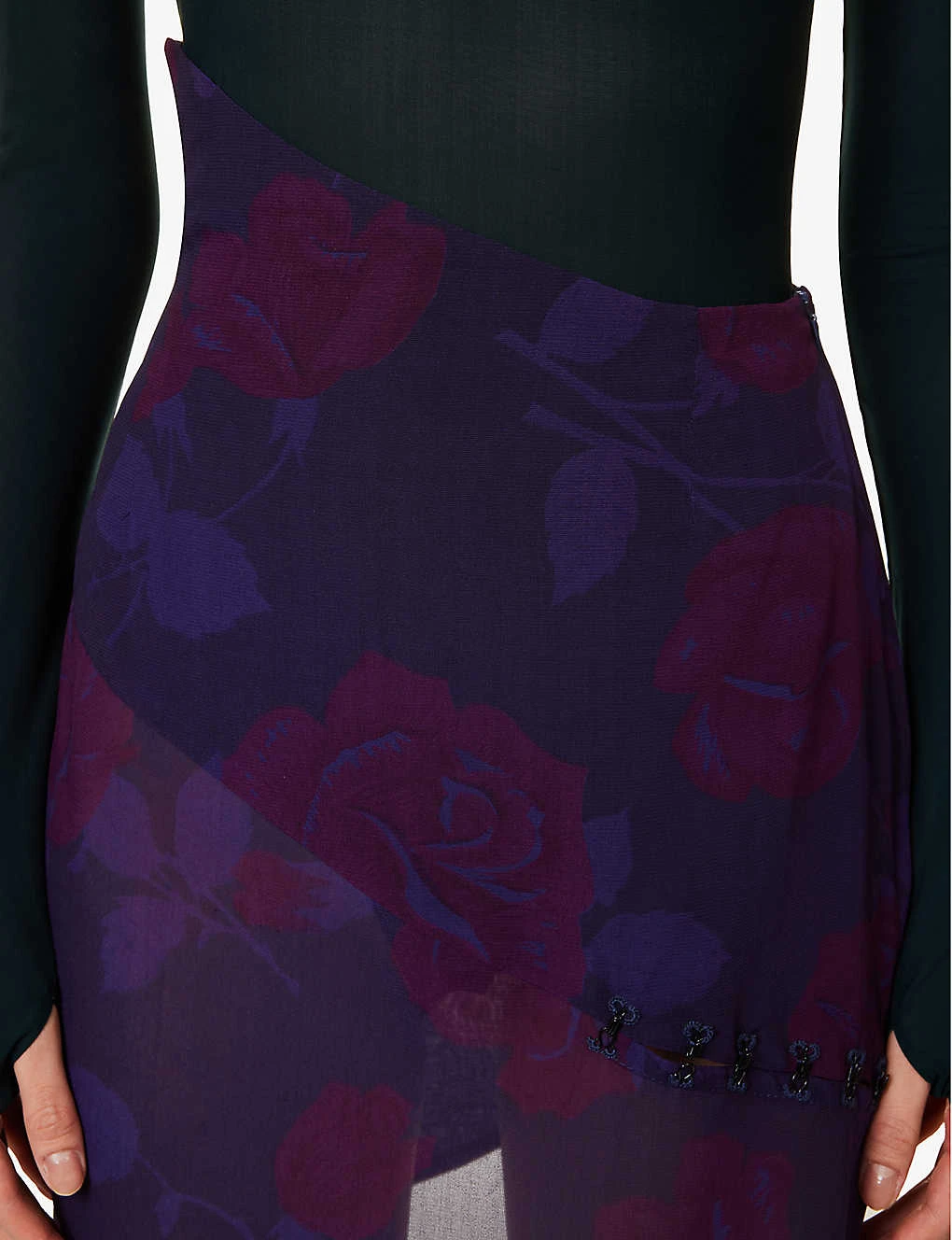 - Regular fit, mid-rise, asymmetric waistband, panelled abstract pattern, floral print, asymmetric hem