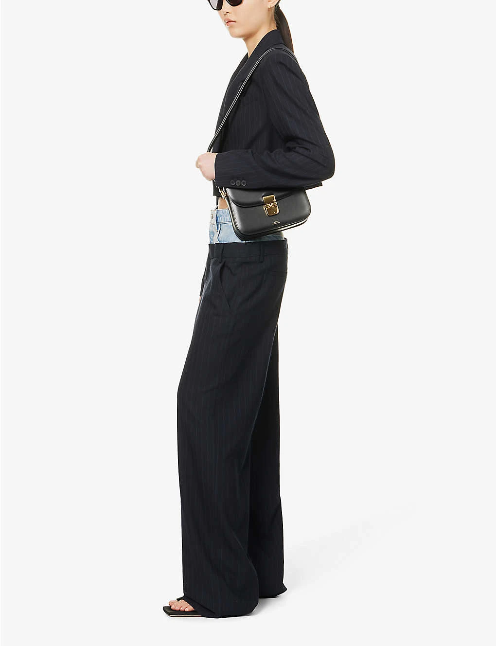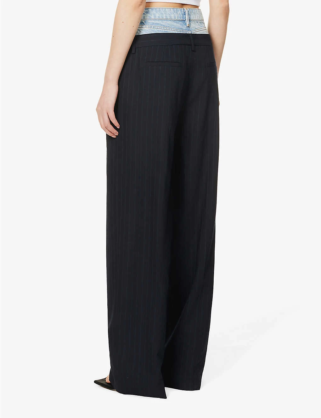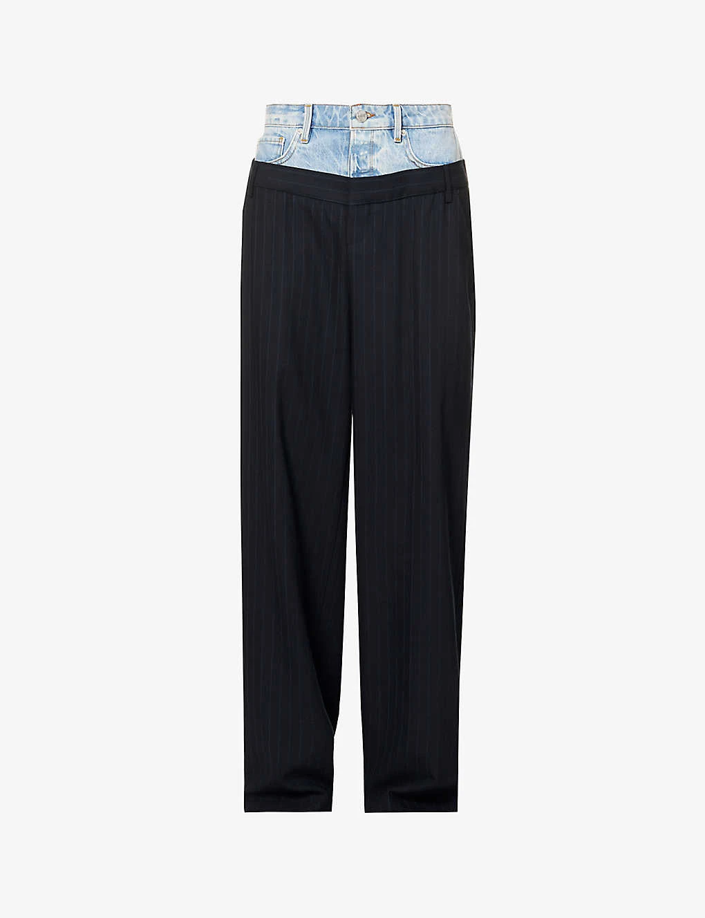 - Regular-fit, high-rise, wide leg, belt loops, contrast stitching, faded denim trim at waist, silver-toned hardware, two slip pockets at front, V-shaped yoke at back, two welt pockets at back, darts at back, all-over pin-stripe pattern, pressed creases at front and back, partially lined