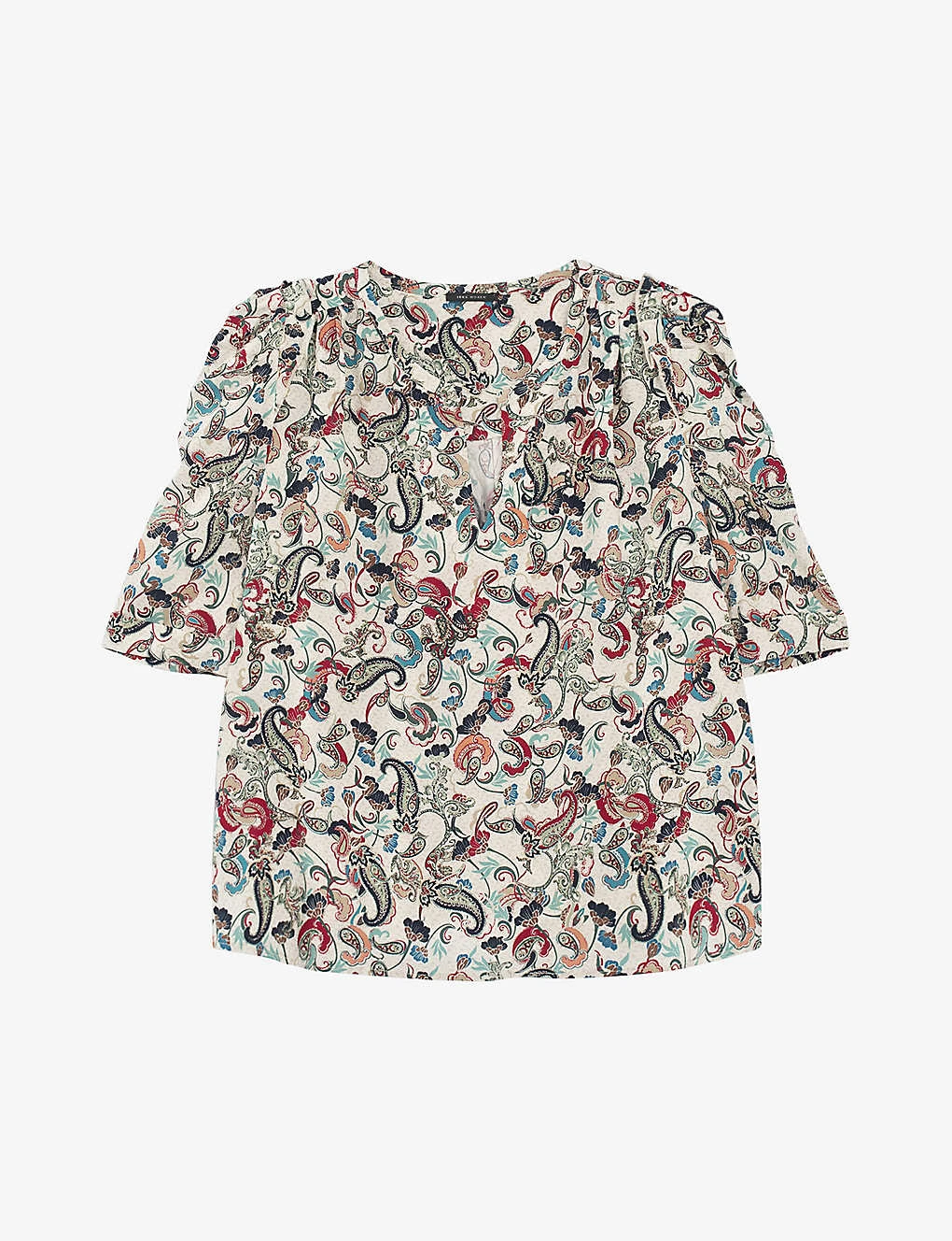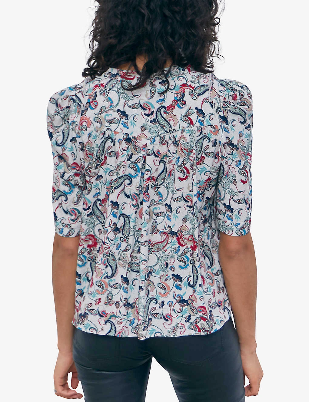 - V-neck, short sleeves, all-over paisley print, turned up cuffs, ruffled seams on back