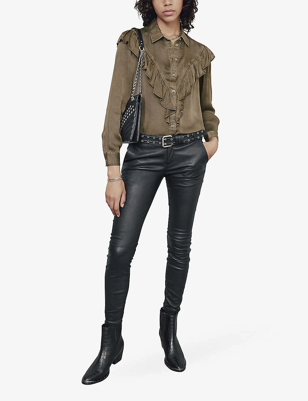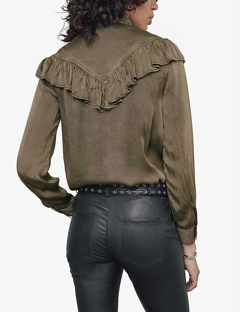 - Spread collar, long sleeves, buttoned cuffs, ruffled trim, faded wash, exposed button fastening
