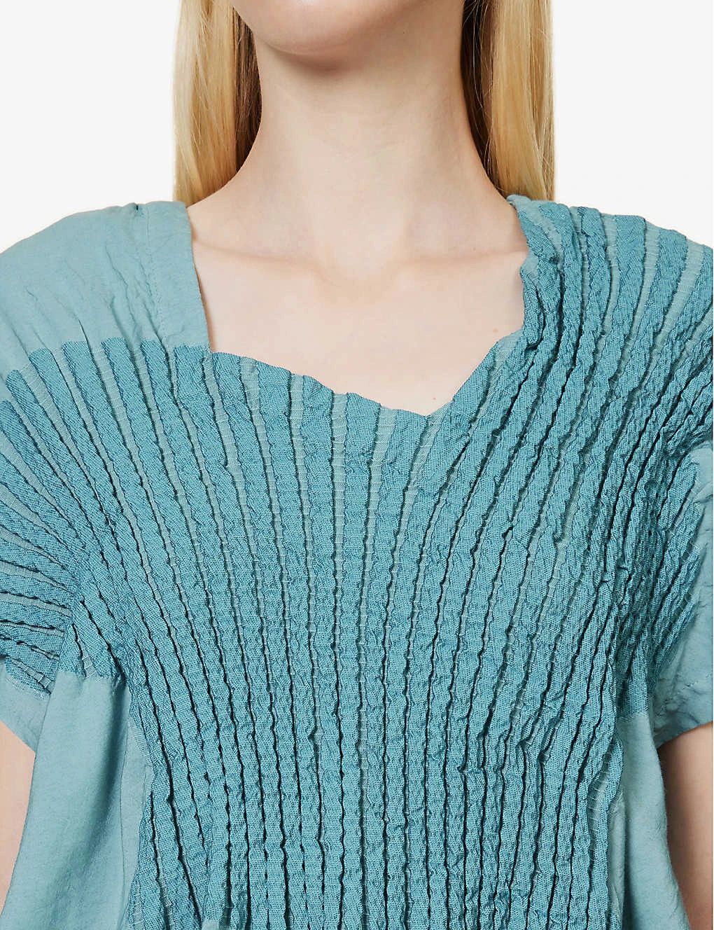 - Regular fit, asymmetric neckline, short sleeves, textured rib panels, soft flared hem