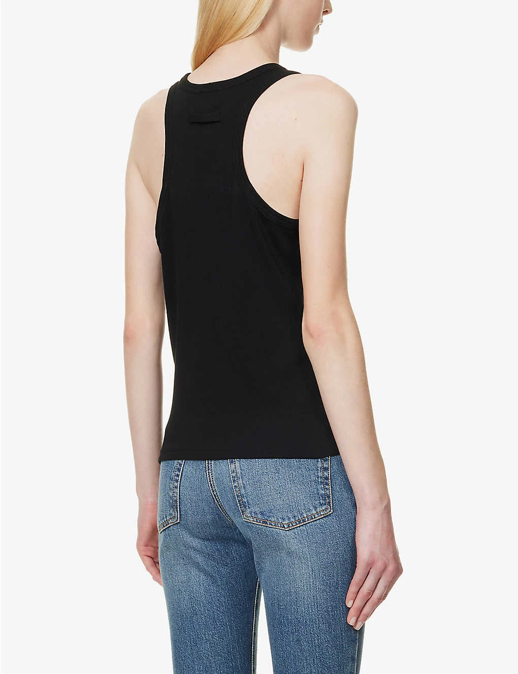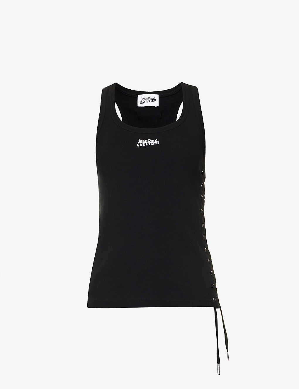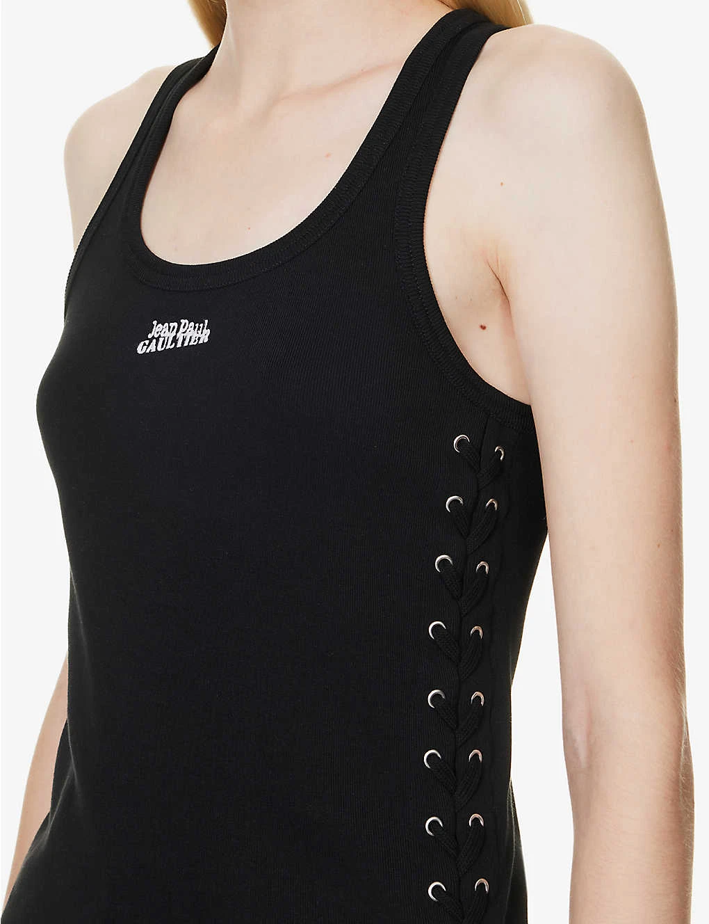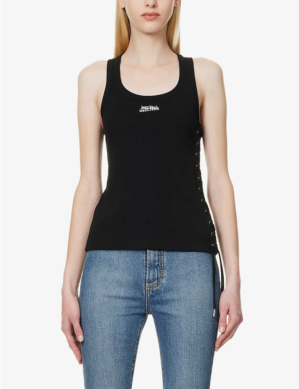 - Regular fit, scoop neckline, sleeveless, lace-up design at side, embroidered branding at front, locker loop at back, all-over ribbed