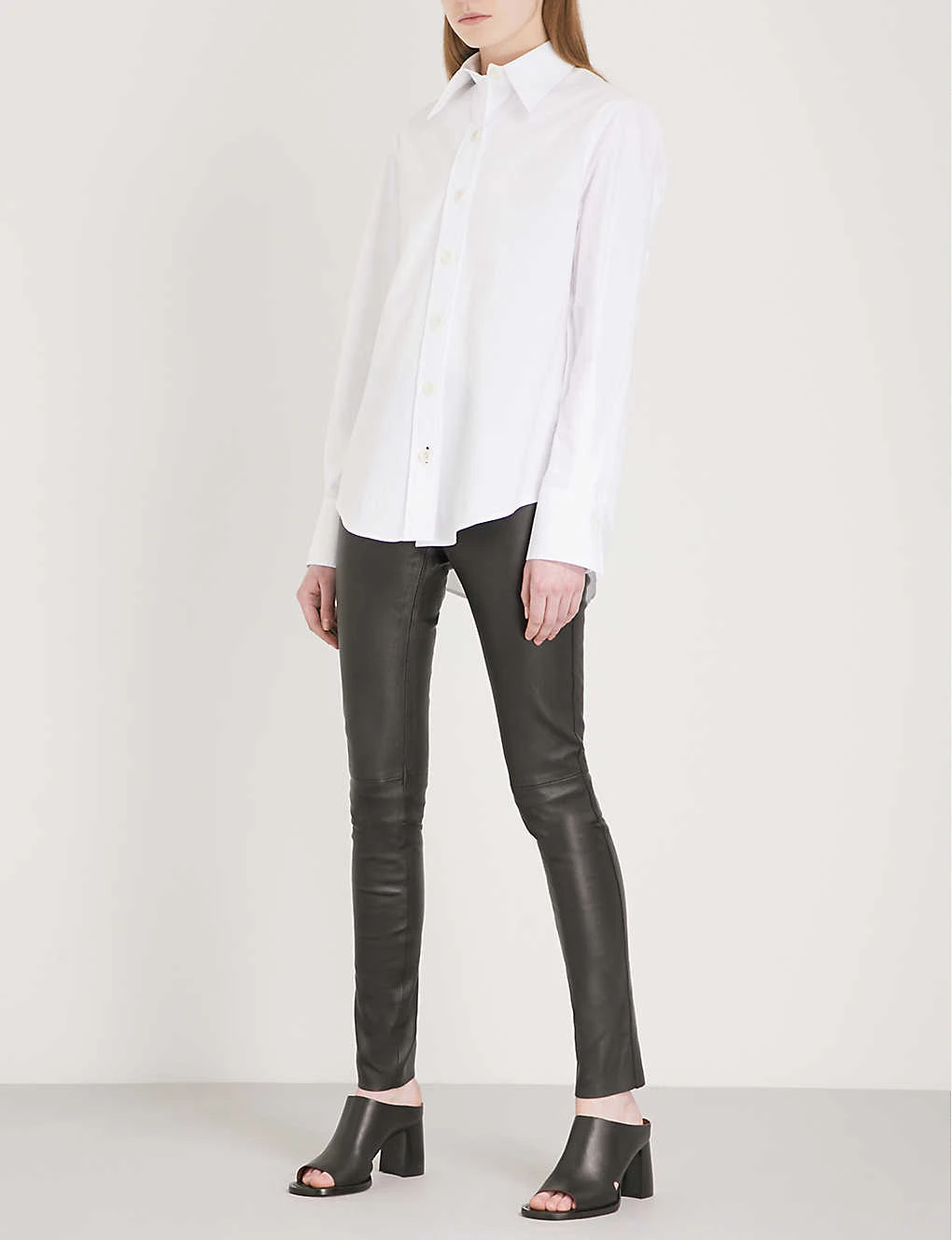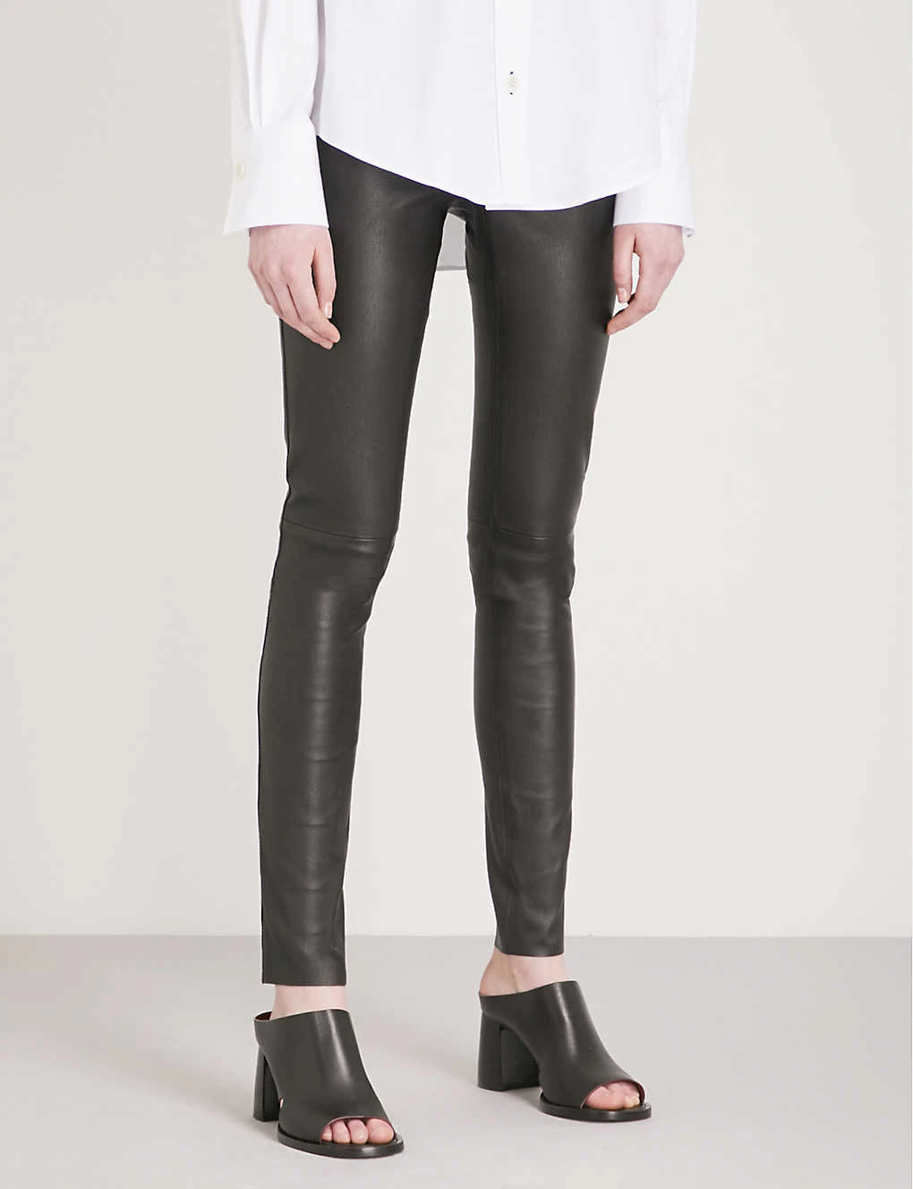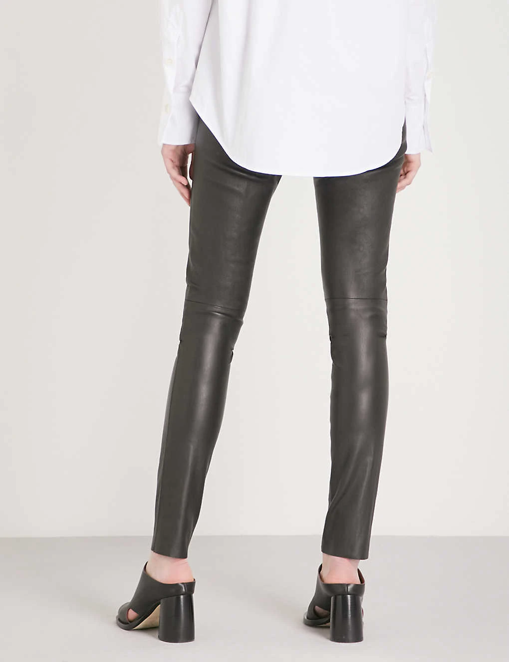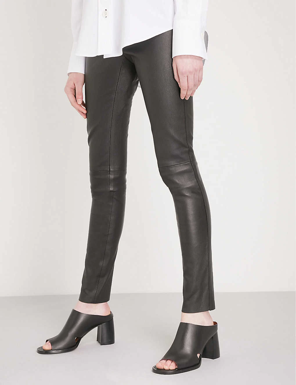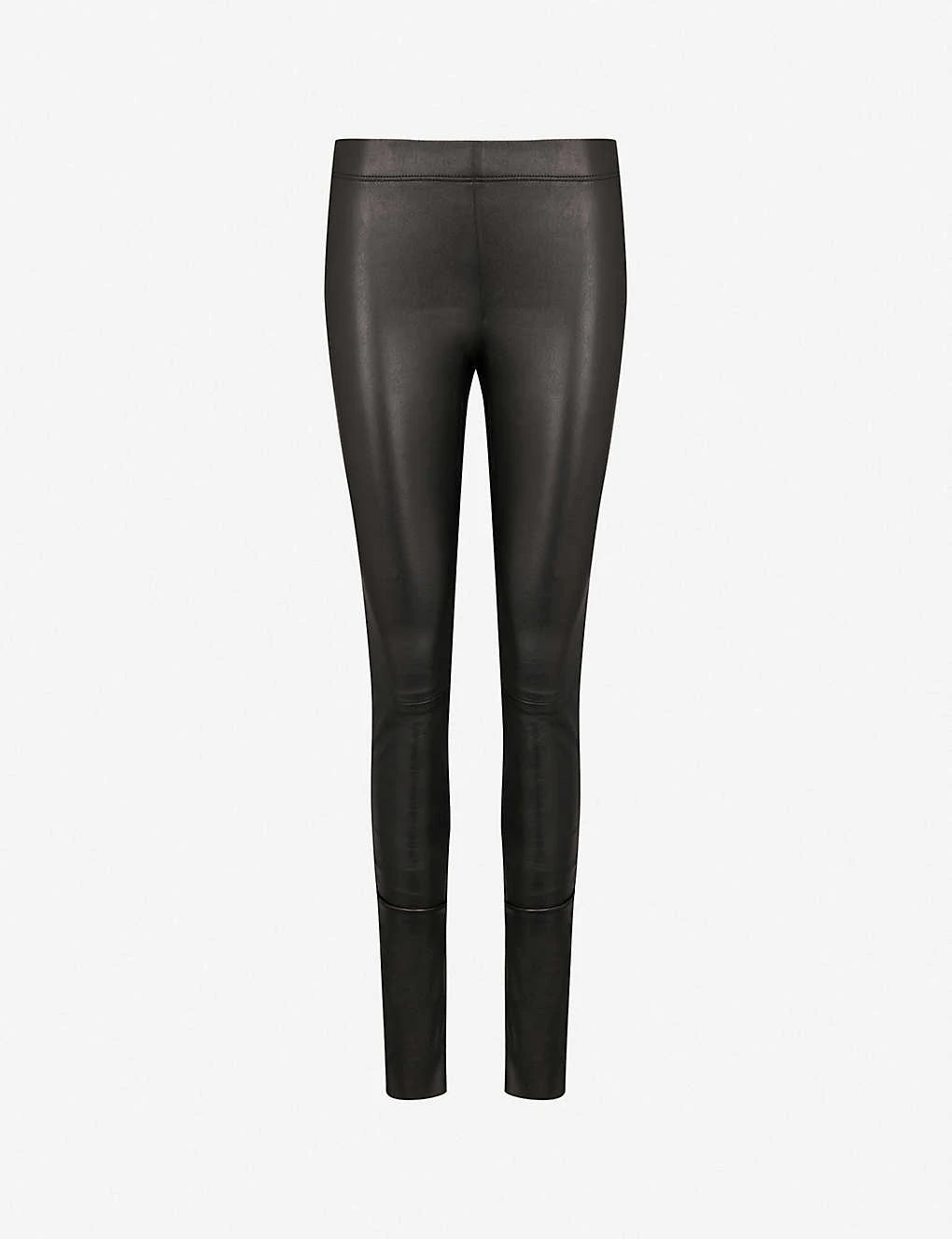 Joseph stretch-leather trousers Slips on Mid-rise, skinny, elasticated waistband at back, tonal stitch detailing 100% leather; 97% cotton, 3% elastane Specialist dry clean True to size Size 8: Rise 8″”, inside leg 34″”, leg opening 10″” Model is 5ft 10″” and wears a size 8
