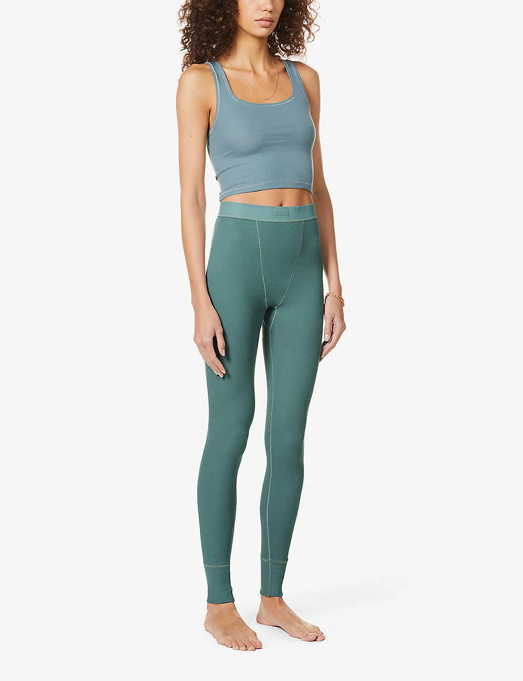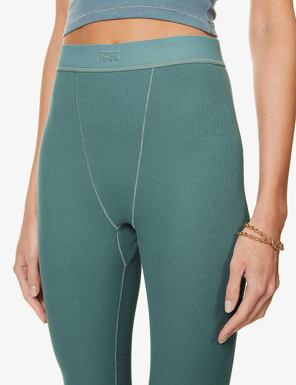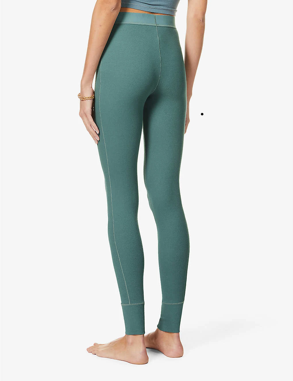 - Slim-fit, high-rise, elasticated waistband, brand patch at front, all-over ribbed texture, exposed seams