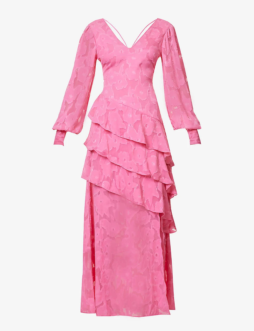 - Regular-fit, V-neck, long cuffed sleeves, double-buttoned cuffs, asymmetric frilled panels at skirt, all-over woven pattern, open back
