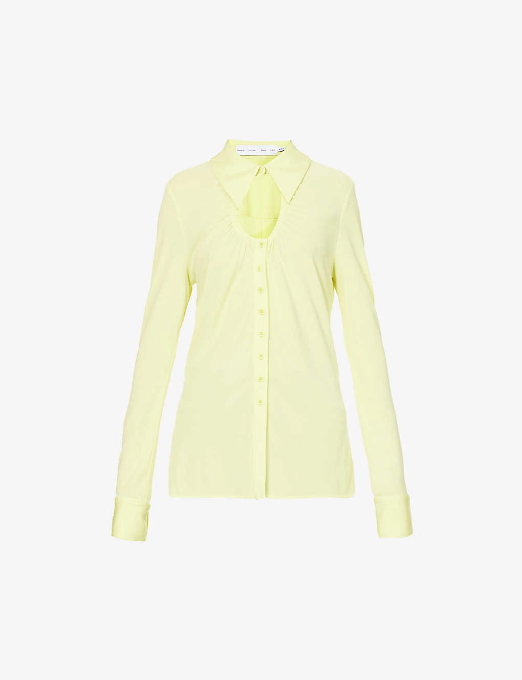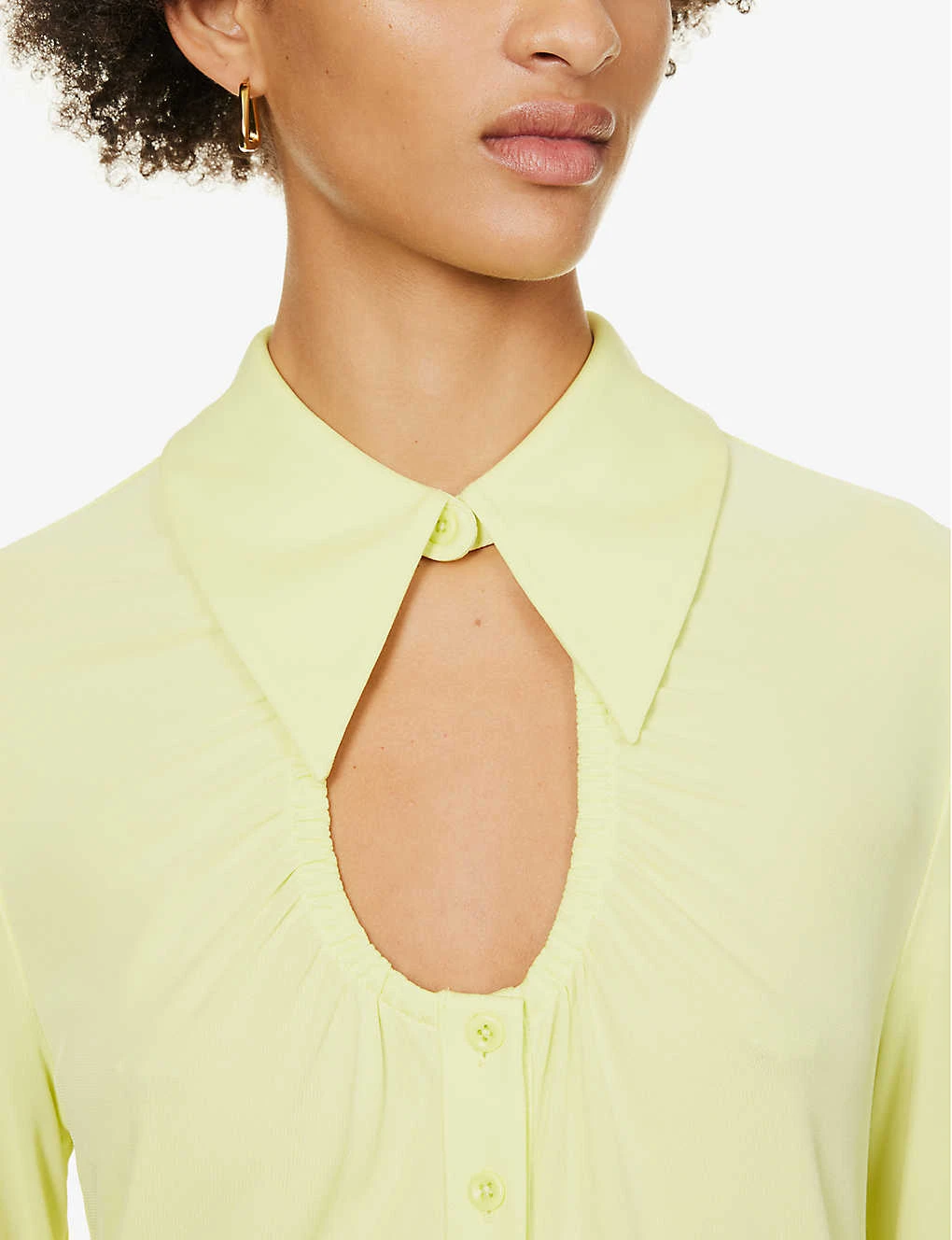 - Regular fit, collar, ruched scoop neckline, long sleeves, buttoned sleeve hems, split at hem sides