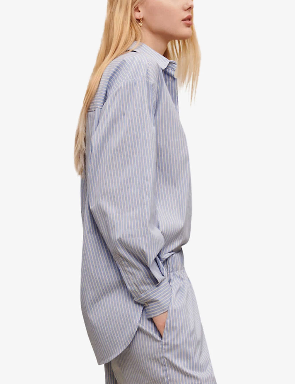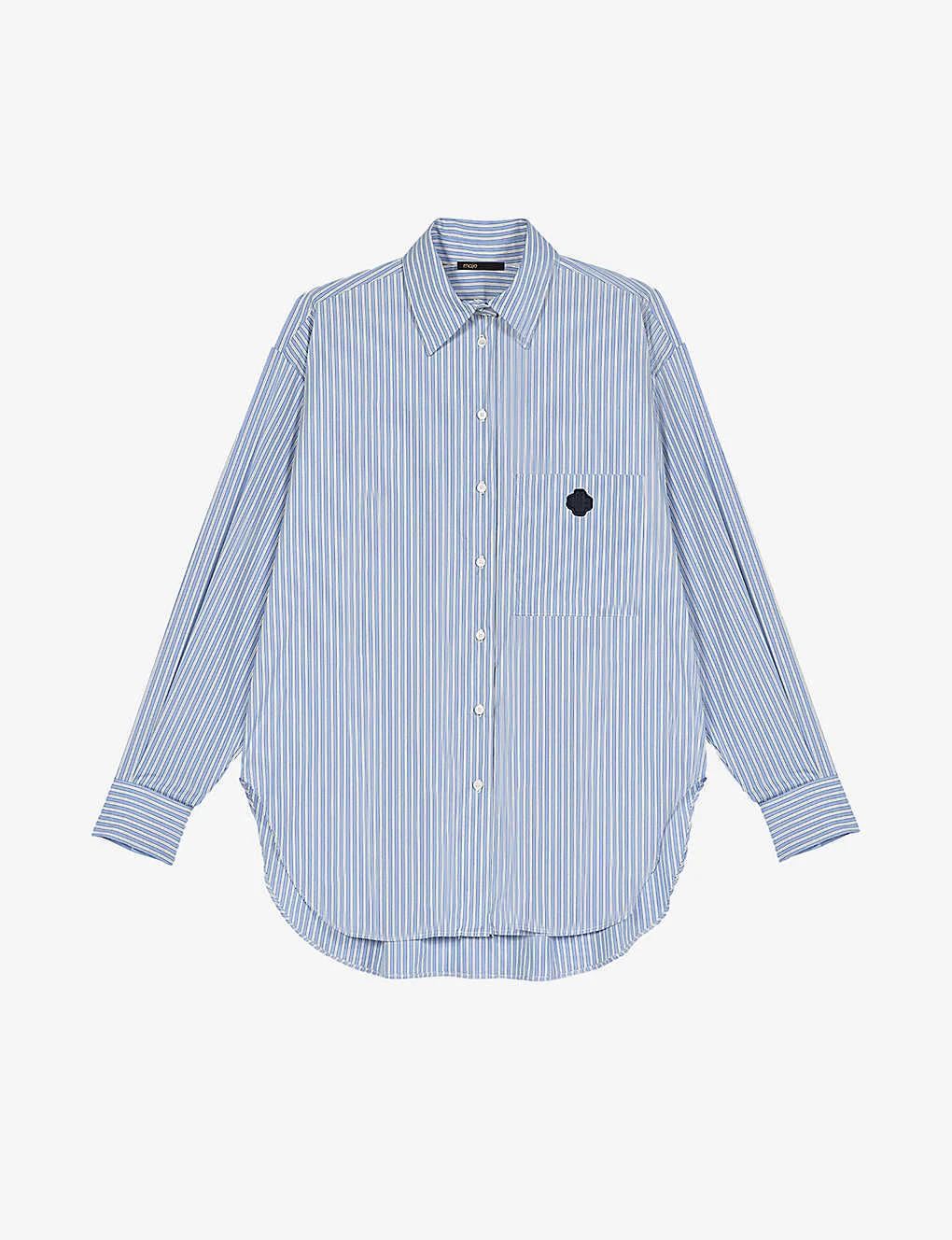 - Relaxed fit, shirt collar, long sleeves, button cuffs, one patch pocket at front, embroidered clover logo at front, all-over striped pattern, curved hem
