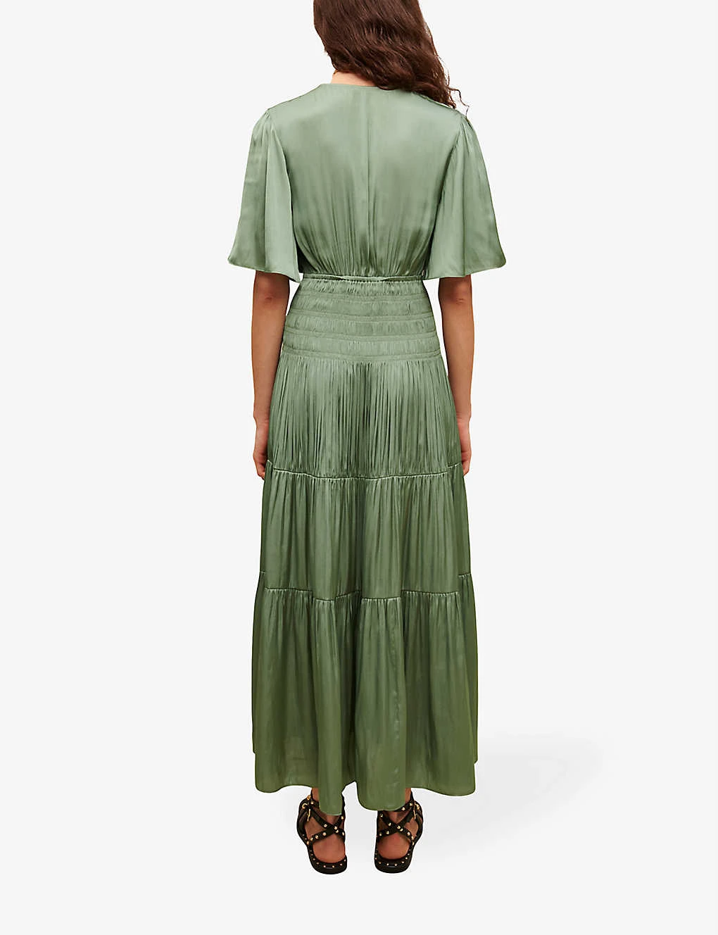 - Maxi length, V neck, short flowy sleeves, fitted waist, shirred panel, pleated skirt