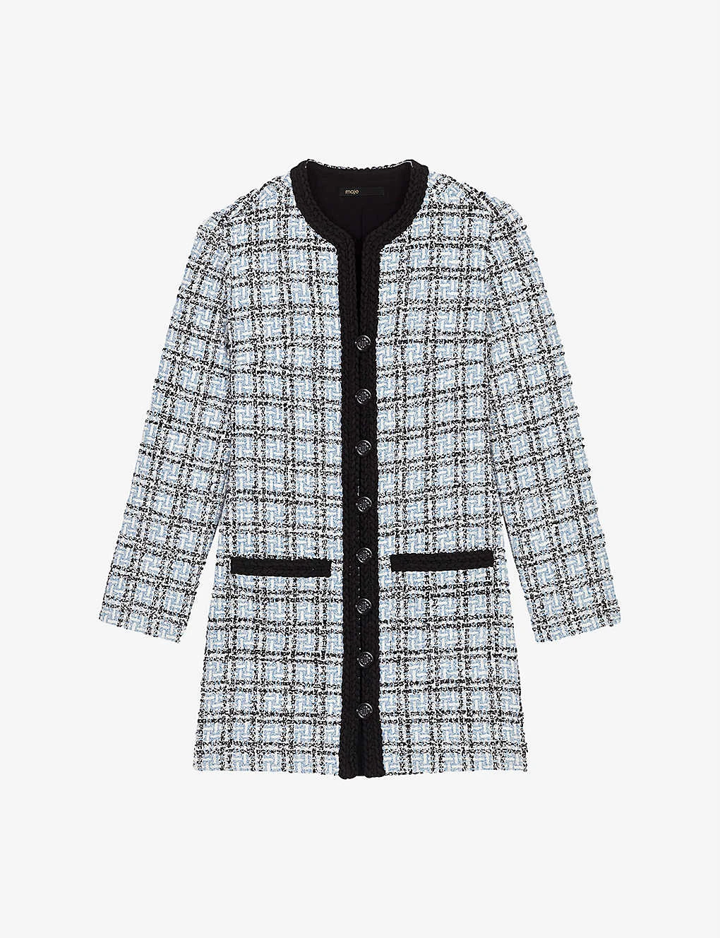 - Split V-neckline, long sleeves, two patch pockets at front, all-over tweed effect, contrasting trims