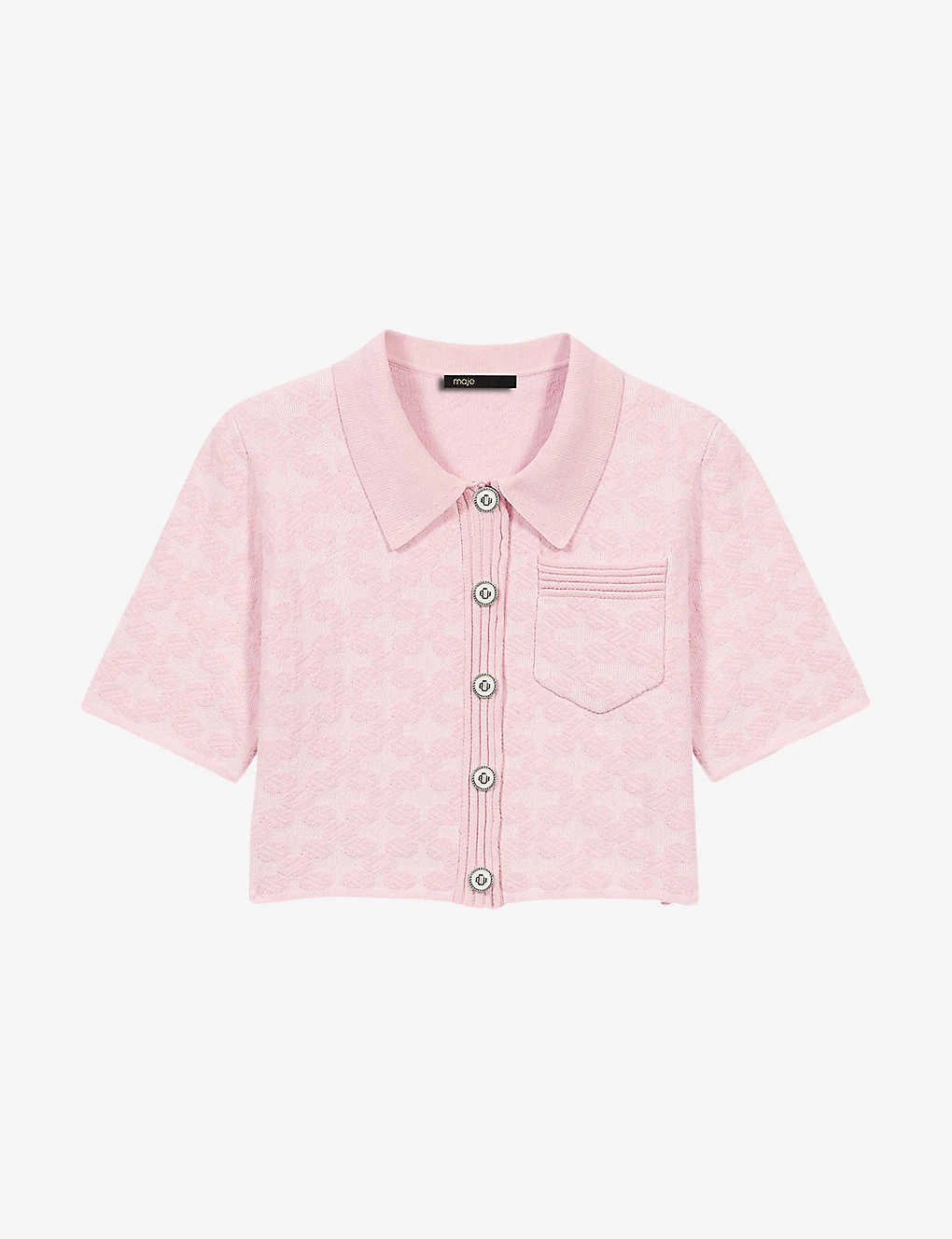 - Pointed collar, short sleeves, one patch pocket at front, all-over textured knit, cropped hem, silver tone hardware