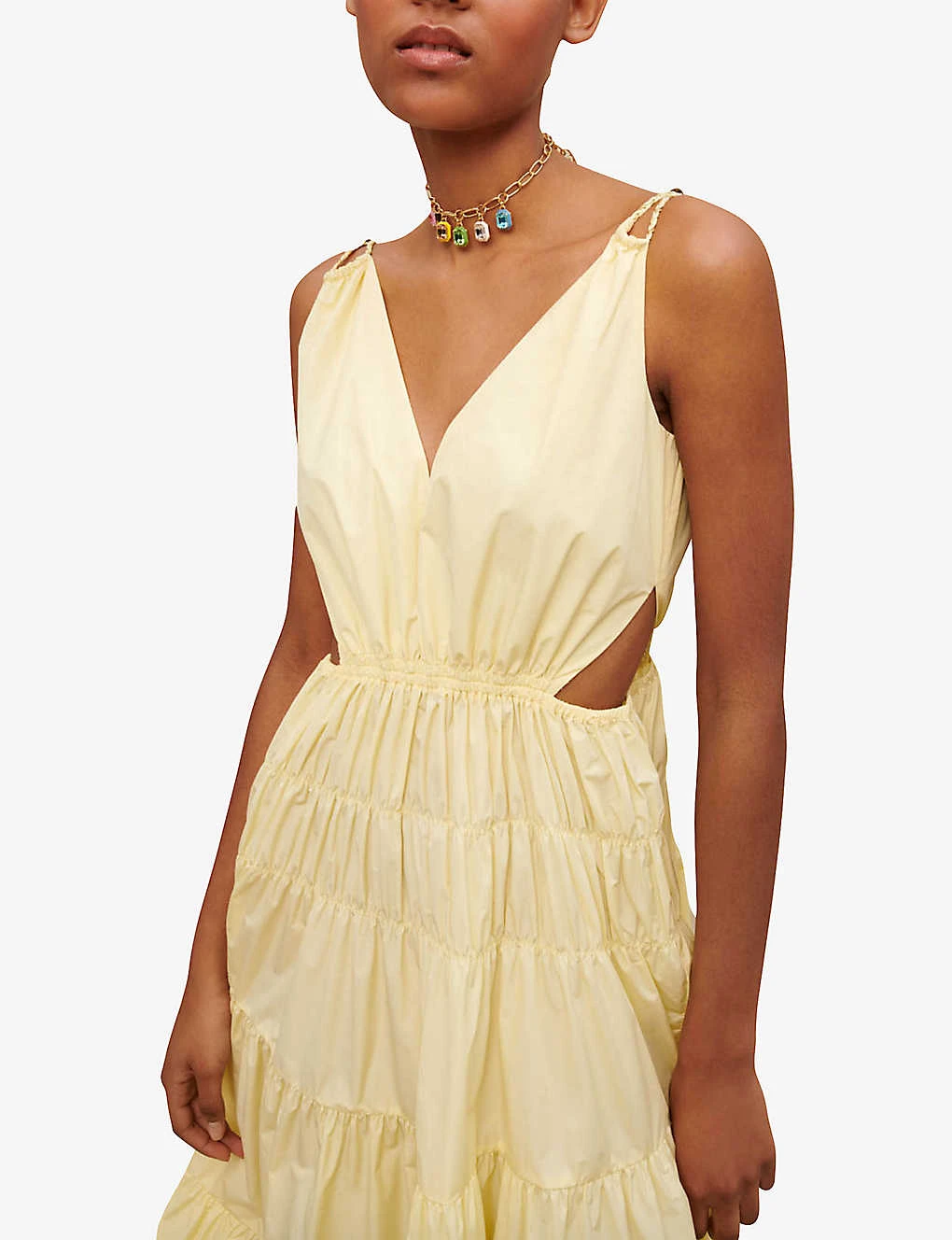 - V-neck, double spaghetti straps, cut-out sides, elasticated waist, gathered panels, midi length, lined