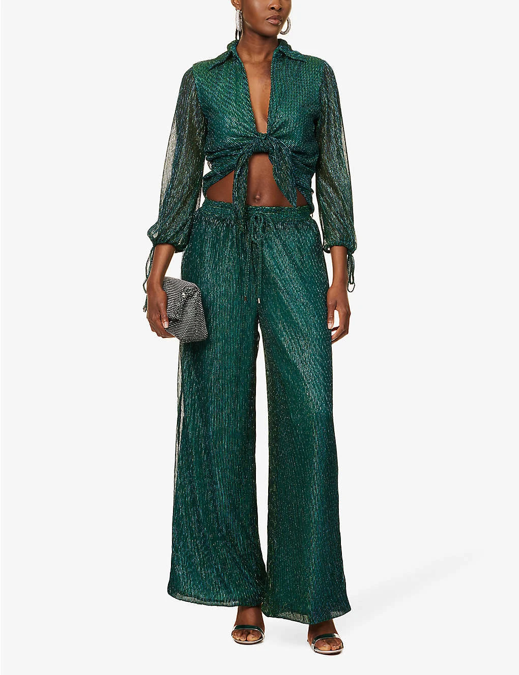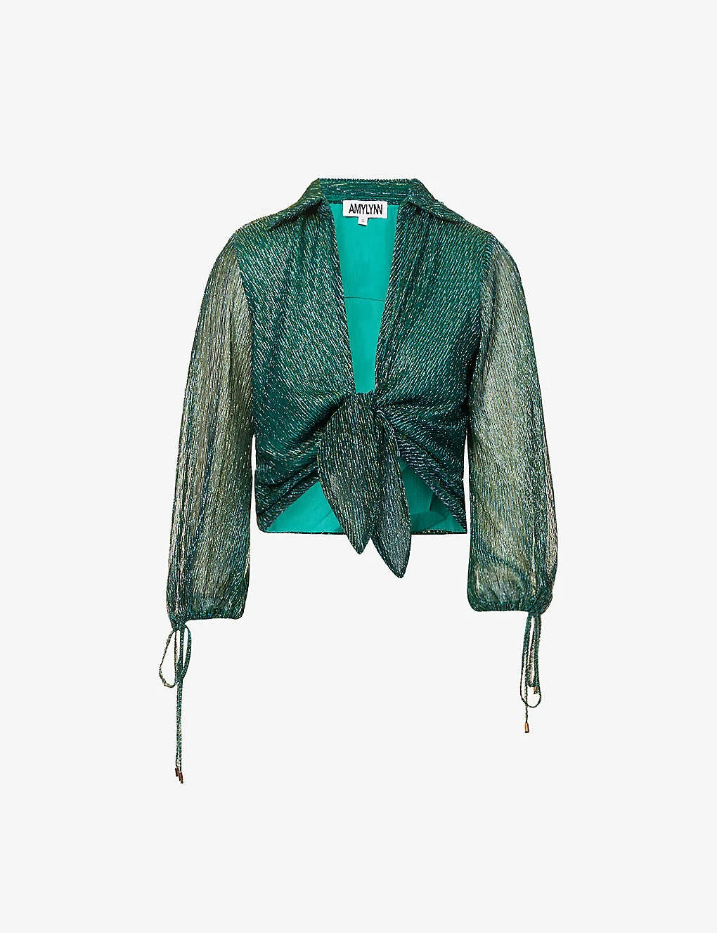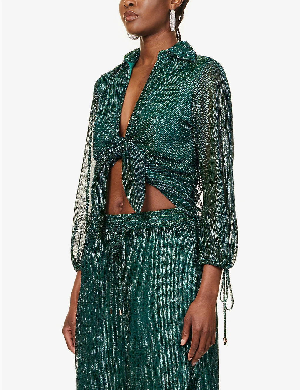 - Regular fit, cropped, collar, V neck, three-quarter sleeves, drawstring cuffs, ruched at front, detachable tie fastening at front, all over pleated, all over metallic weave, fully lined, asymmetric hem