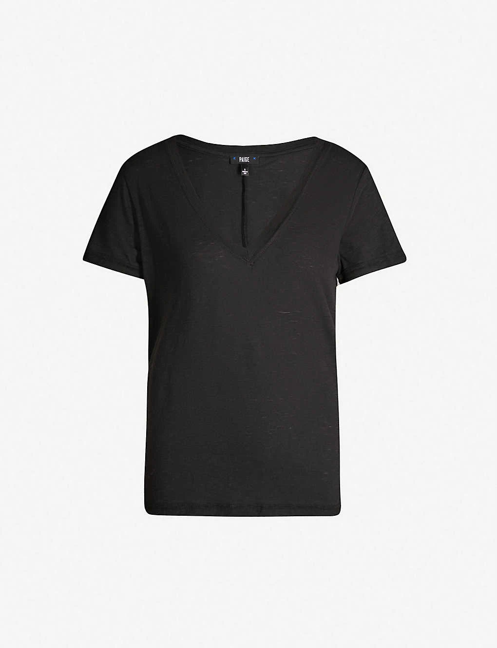 Paige cotton and modal-blend T-shirt Slips on V-neck, short sleeves, branded stitching at side seam, ribbed trims, straight hem 60% cotton, 40% modal Machine wash True to size Size small: length 22″” Model is 5ft 10.5″” and wears a size small