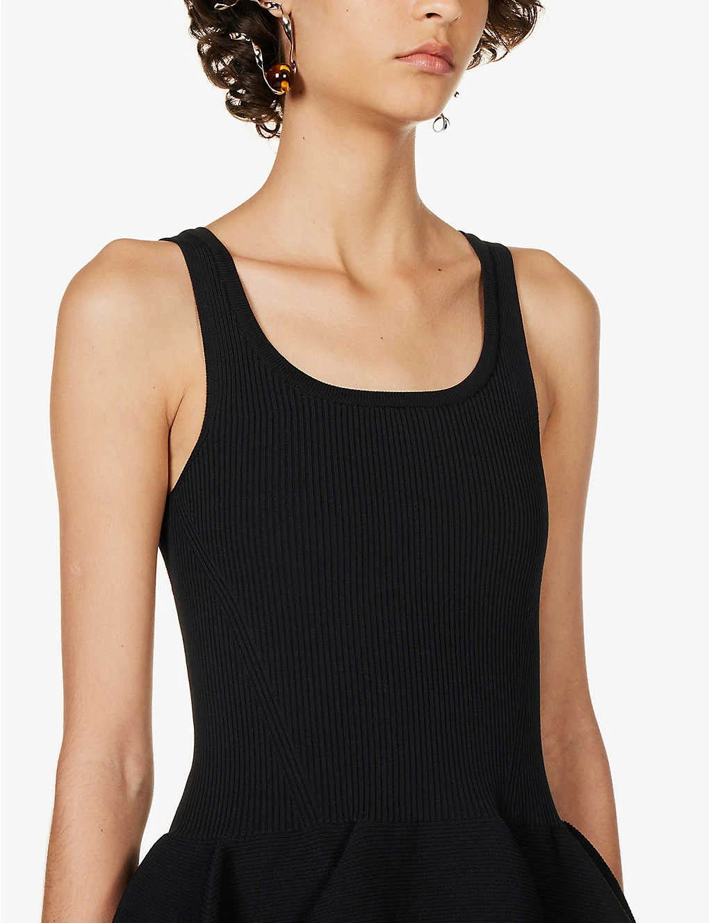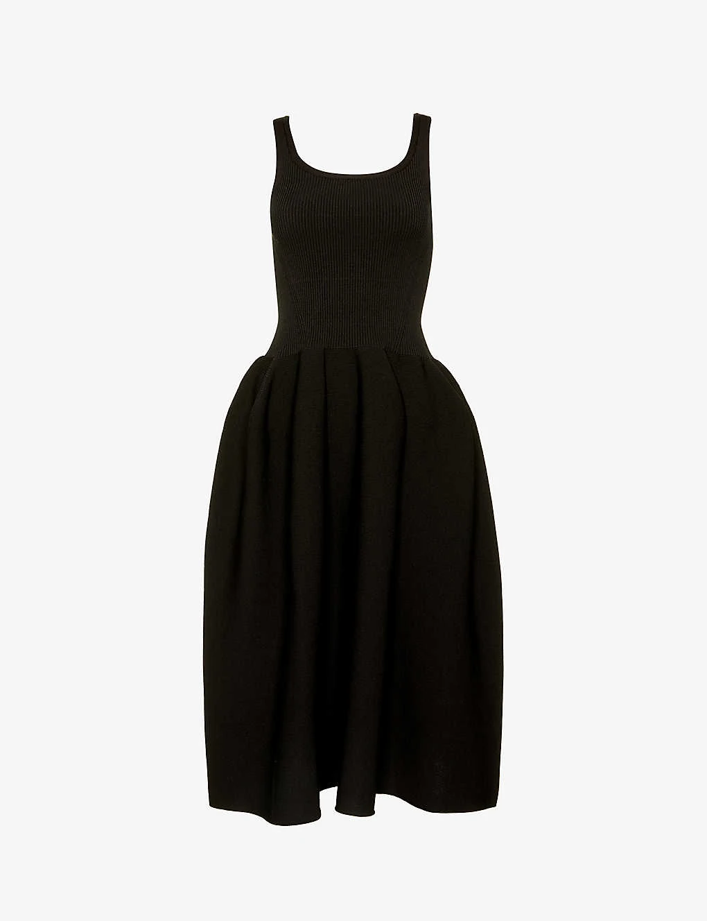 - Slim fit, scoop neckline, sleeveless, ribbed knit pattern at bodice, medium knit texture, flared hem