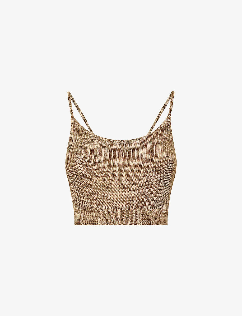 - Slim fit, scoop neck, thin straps, metallic finish, cropped length