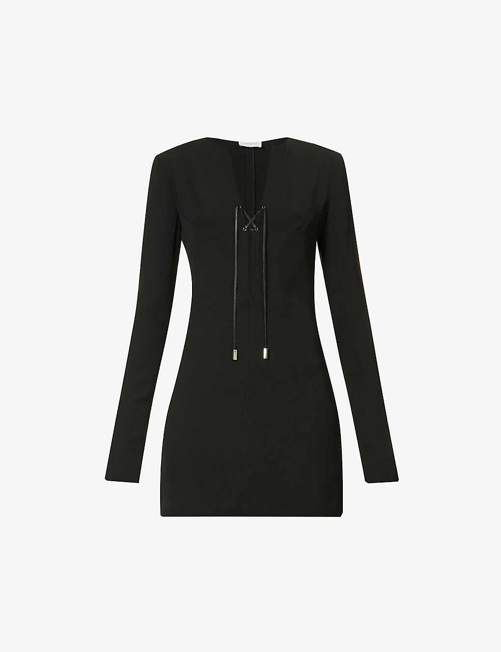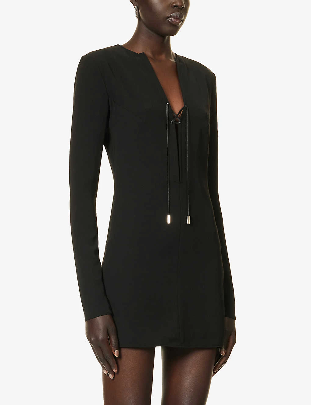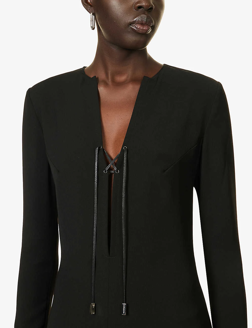 - Relaxed fit, plunging V-neck, lace-up panel at chest, long sleeves, A-line hem