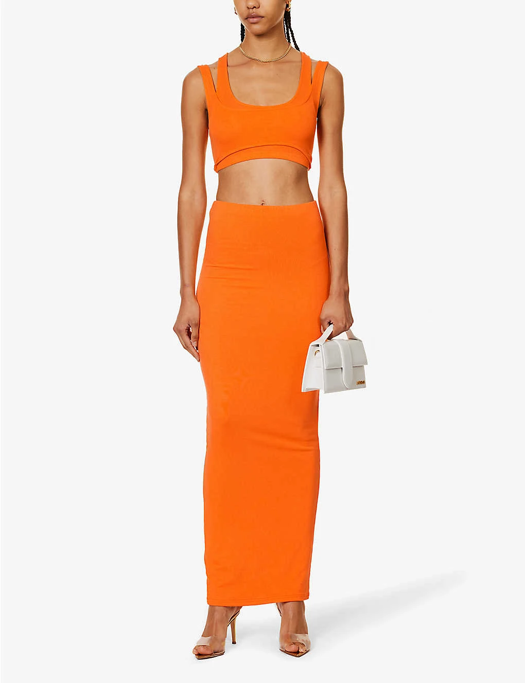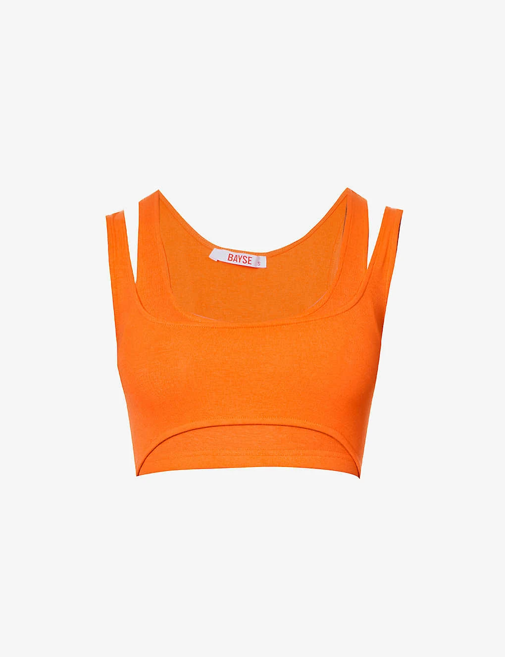 - Slim fit, scoop neckline, double shoulder straps, elasticated hem, cropped