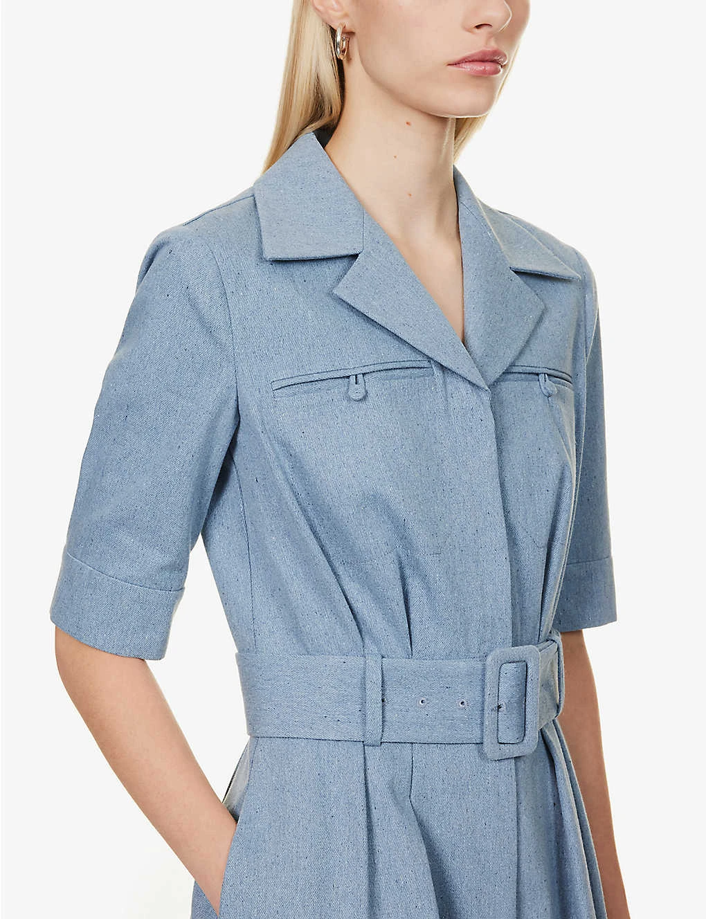 - Regular fit, notched lapels, short sleeves, buttoned cuffs, two buttoned welt pockets at chest, belt loops, detachable buckle belt at waist, two slip pockets at sides