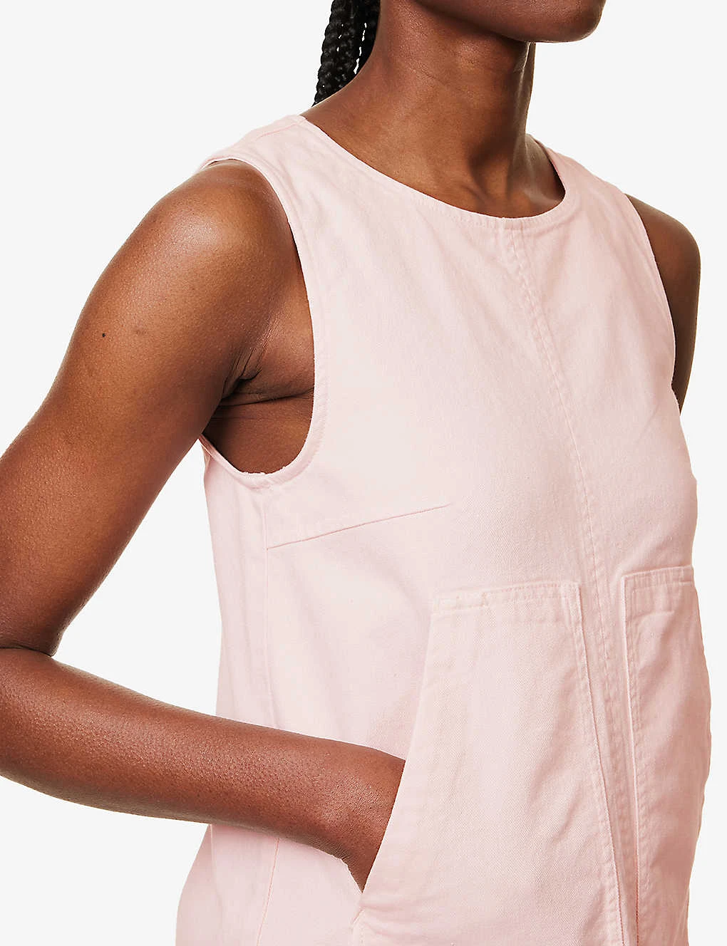 - Regular fit, round neckline, sleeveless, dropped armholes, darts at chest, two angled patch pockets at front, A-line silhouette, silver-toned hardware