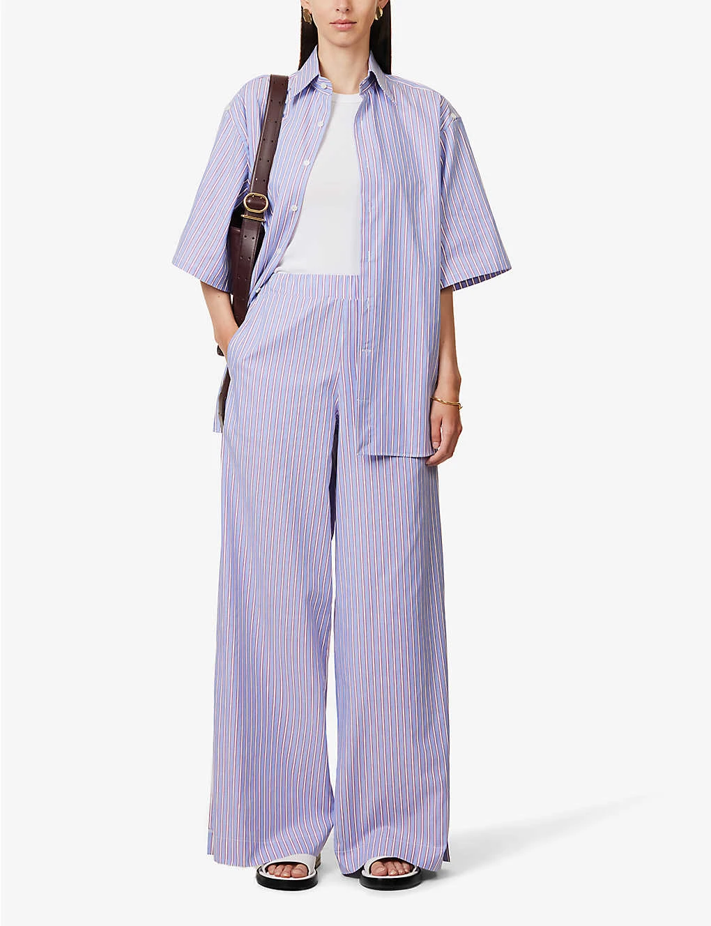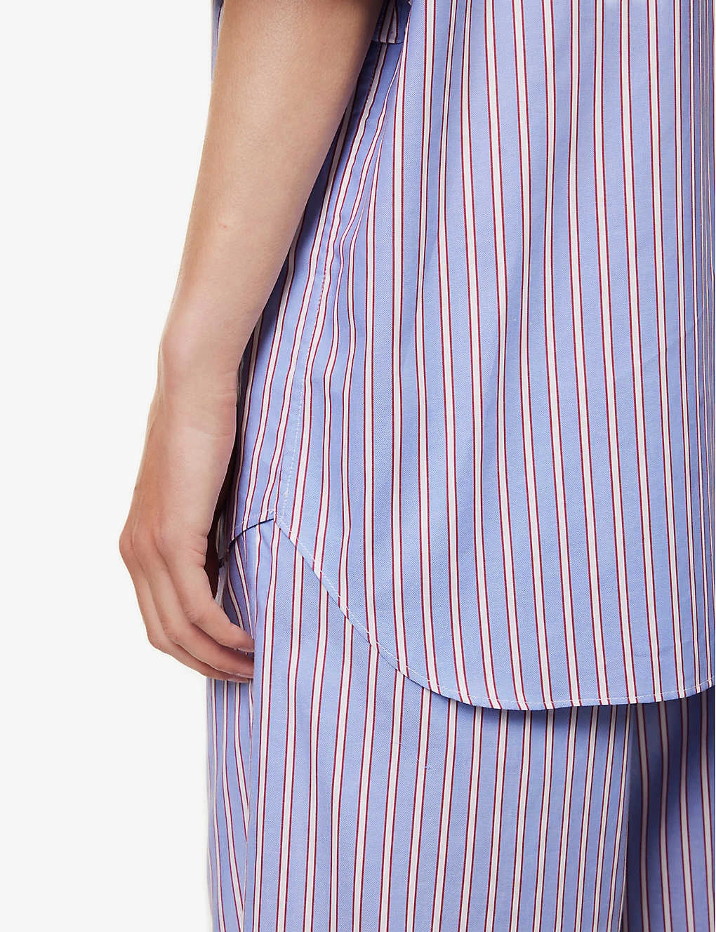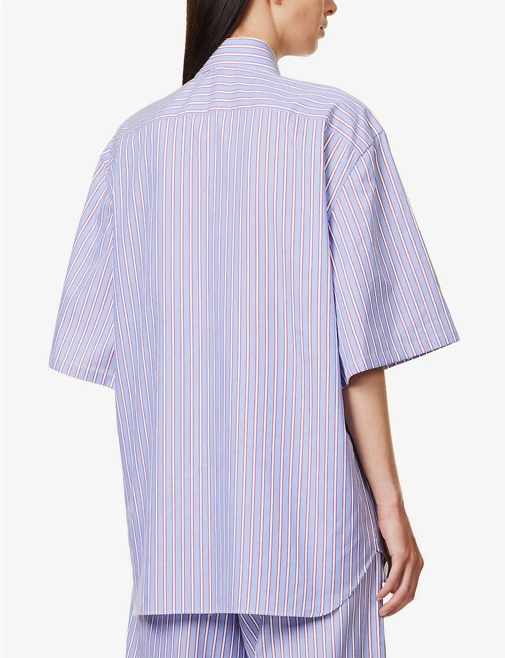- Relaxed fit, collar, short sleeves, buttoned cuffs, all-over stripe pattern curved hem