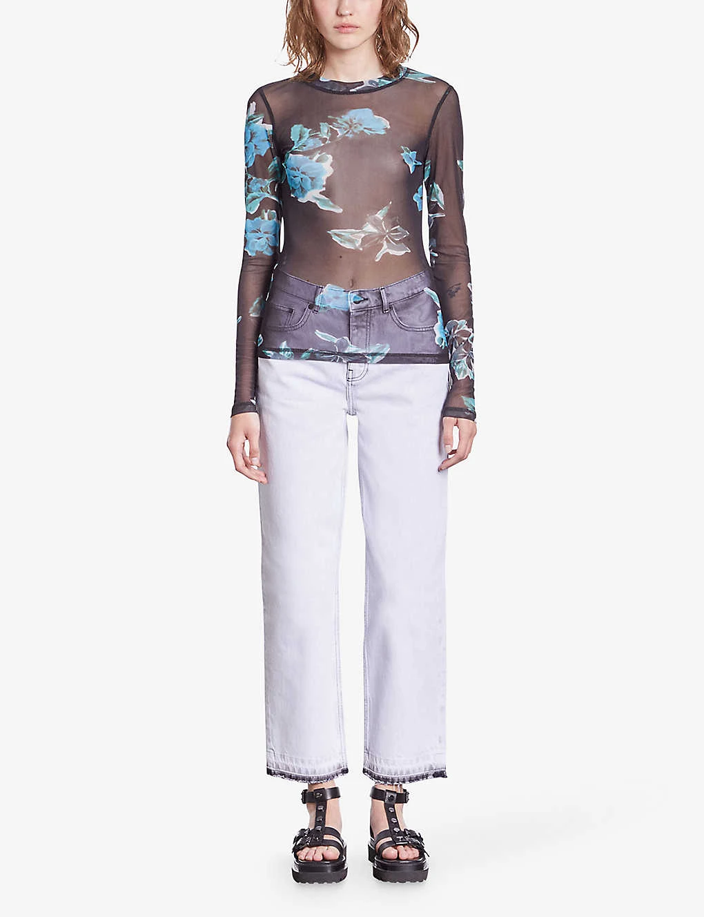 - Round neck, long sleeves, all-over floral print, sheer finish