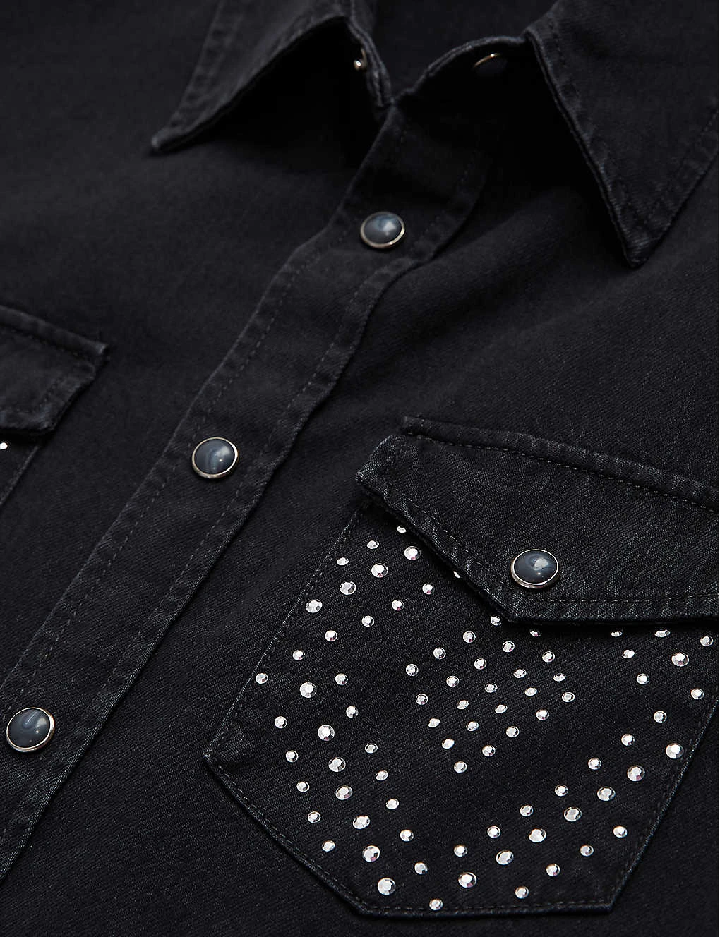 - Peak collars, long sleeves, two exposed buttoned pockets at chest, stud detail on chest pockets, buttoned cuff