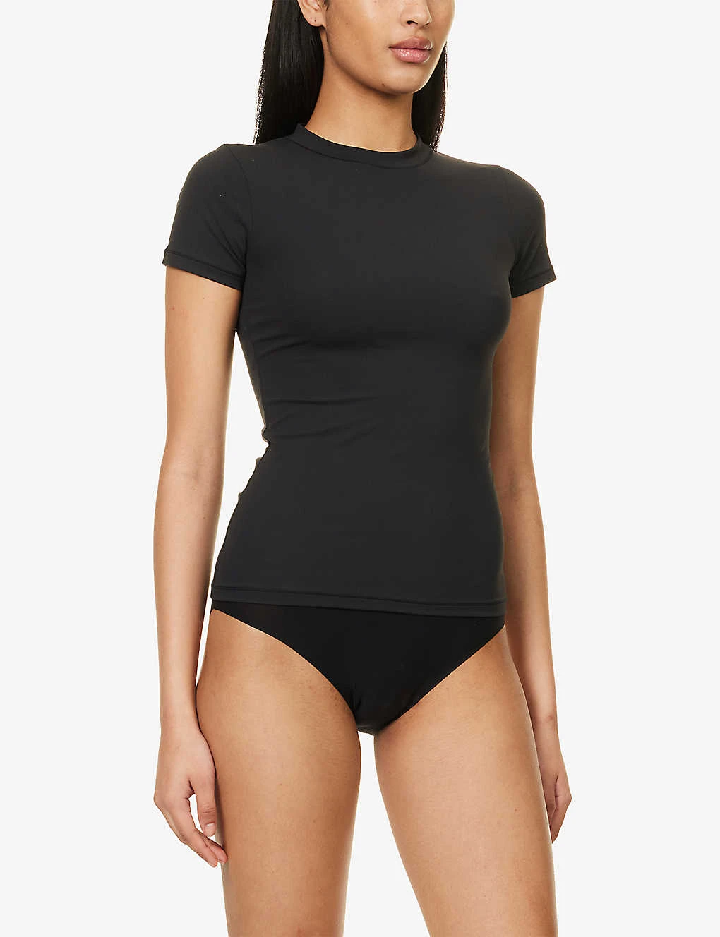 - Slim-fit, round neck, short sleeves, seamless