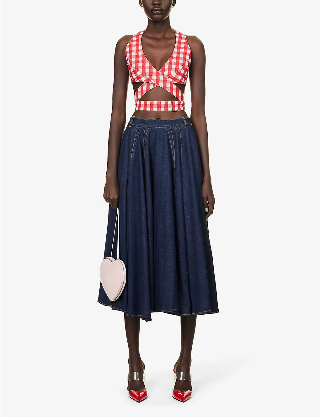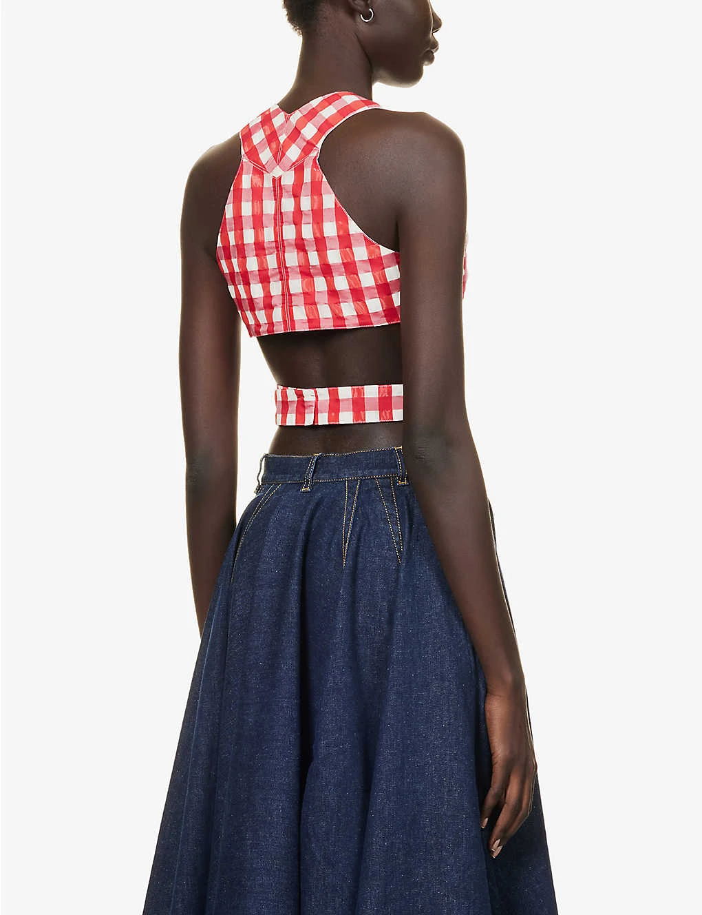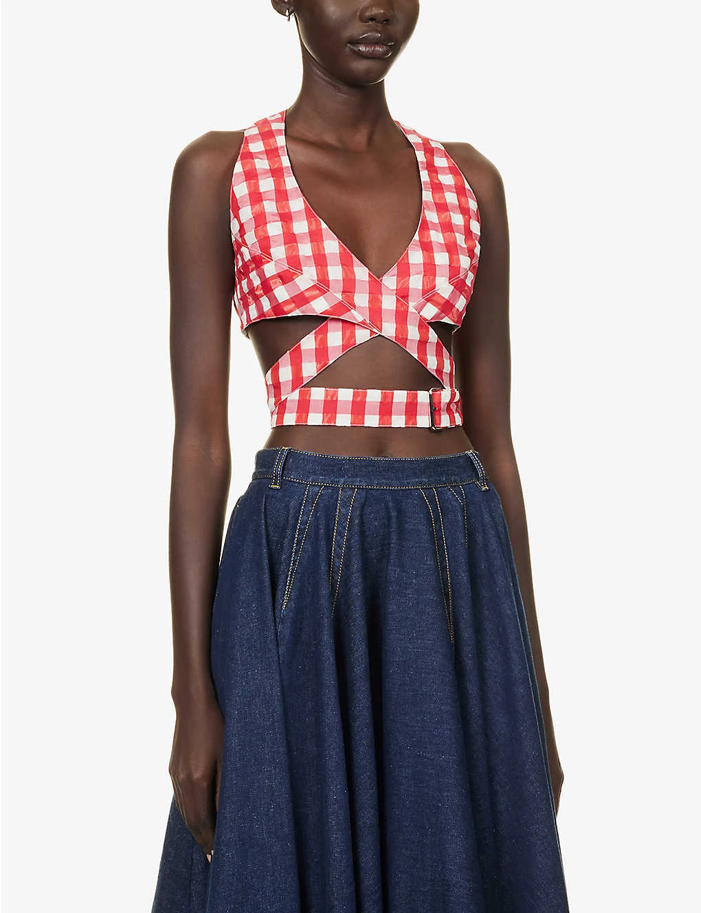 - Regular fit, V-neck, sleeveless, wrap-around design, all-over check pattern, silver-toned hardware, cropped