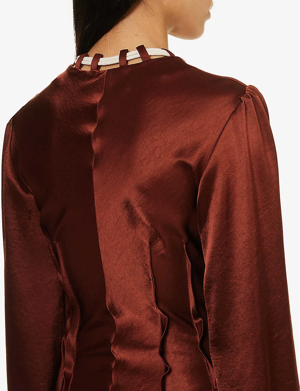 - Regular fit, V-neck, rope design at neckline, long sleeves, darts at front and back, flared skirt