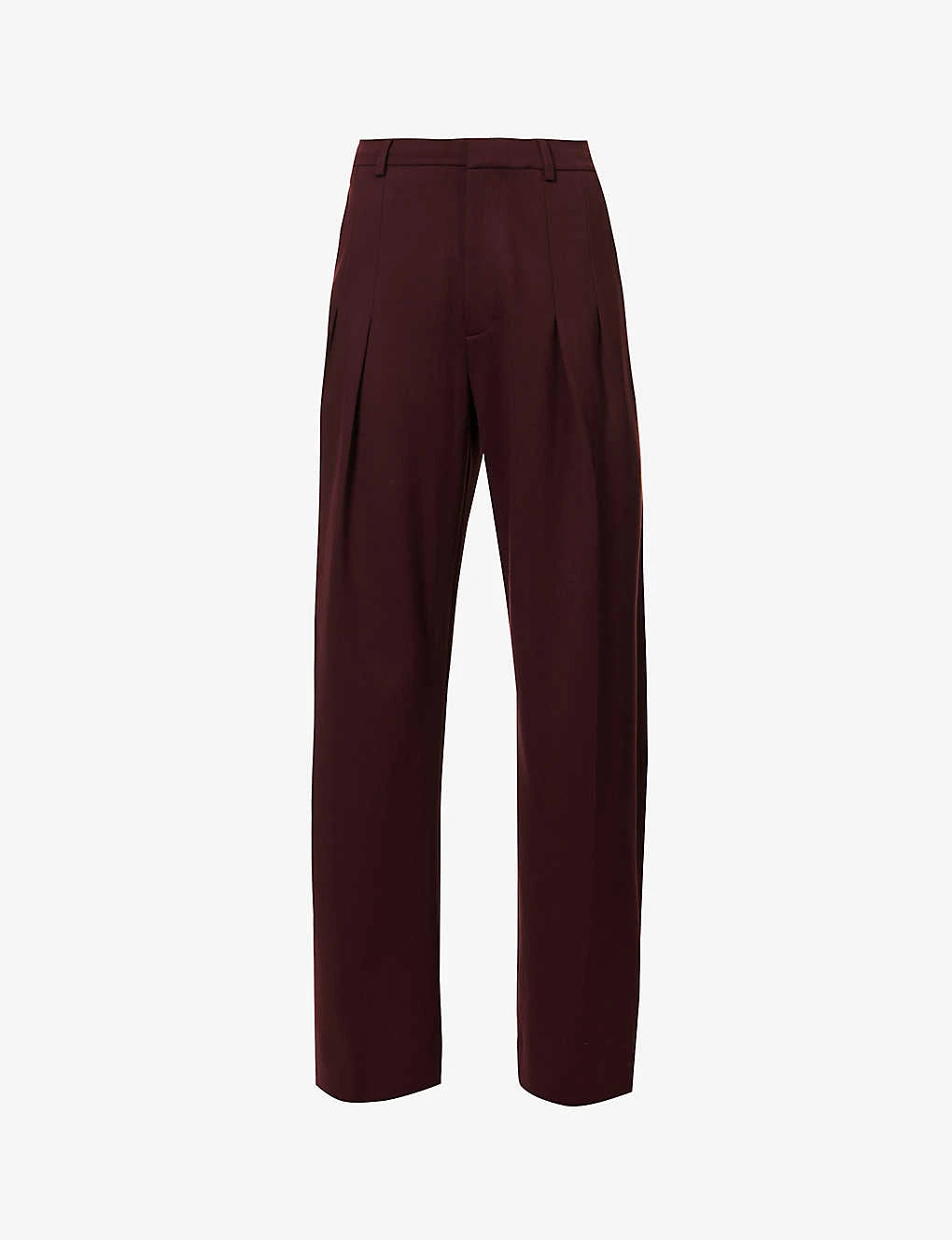 - Relaxed fit, high rise, straight leg, belt loops, two slip pockets at sides, four inverted pleats at front, darts at back, two jetted pockets at back