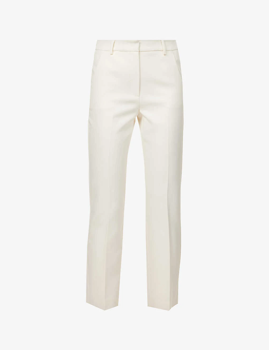 - Regular fit, mid-rise, tapered leg, structured waistband with belt loops, two slip pockets at front, darts at back, two buttoned welt pockets at back, pressed centre creases