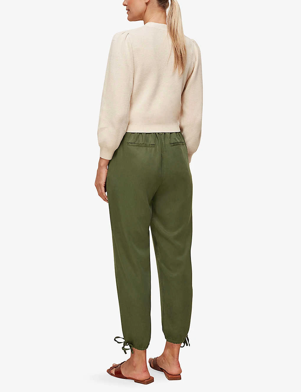 - High rise, tapered leg, belt loops, elasticated waistband, two slip pockets at sides, branded hardware, two jet pockets at back, self-tie cuffs