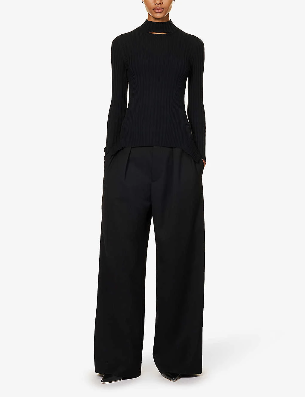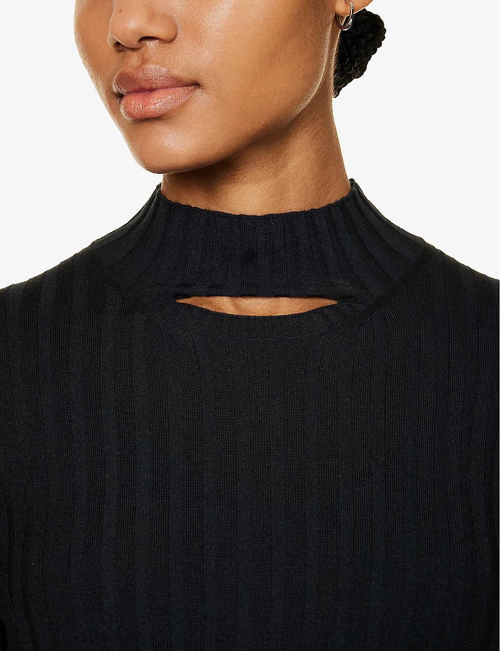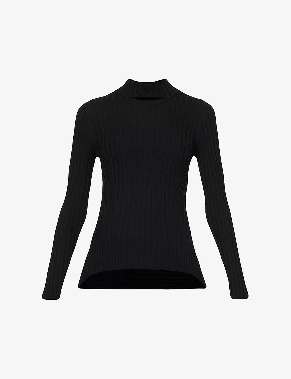 - Slim fit, high neck, cut-out at neck, long sleeves, ribbed knit, fine knit texture, asymmetric hem