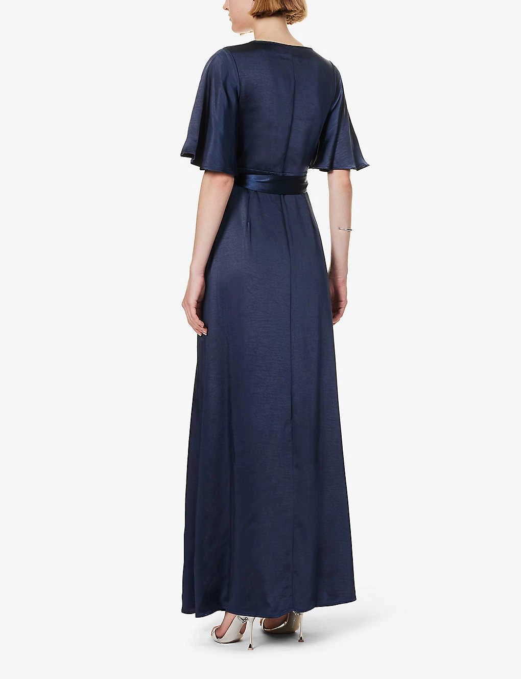 - Slim fit, V neck, wrap front, flared short sleeves, high waist, all over satin texture, flared hem