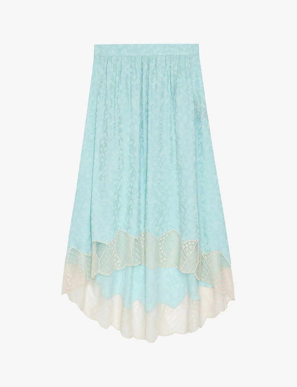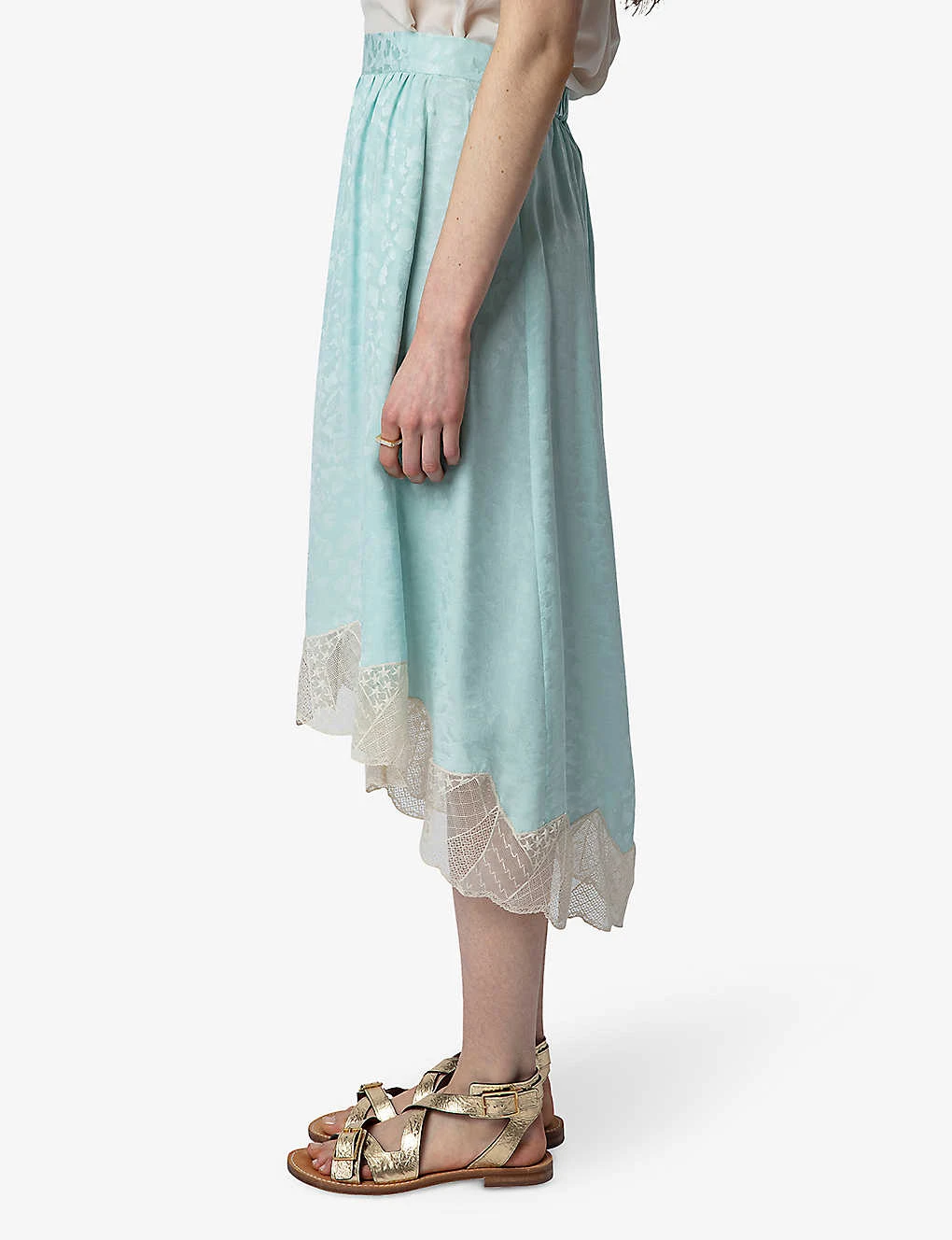 - Mid-rise, elasticated waistband at back, all-over leopard jacquard, midi, contrasting lace trim, asymmetric scalloped hem